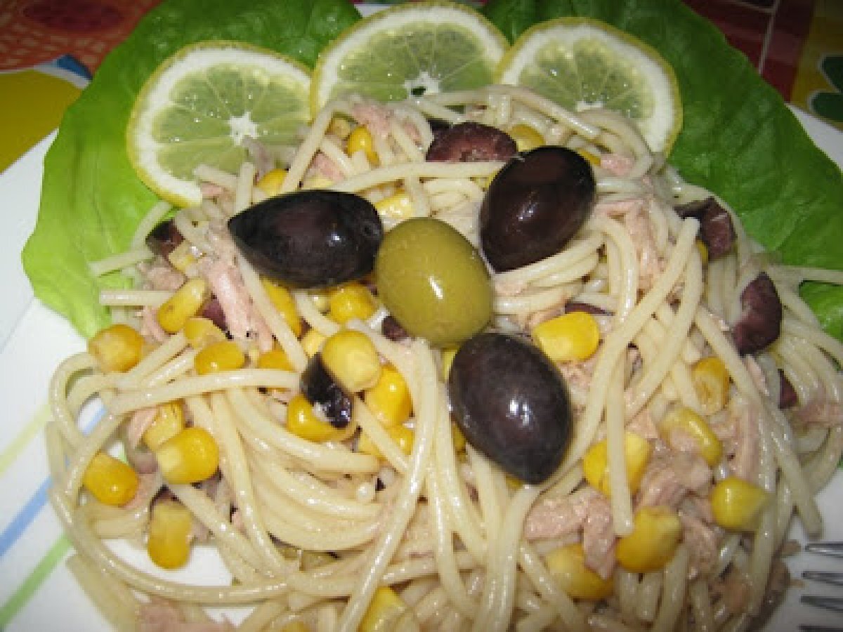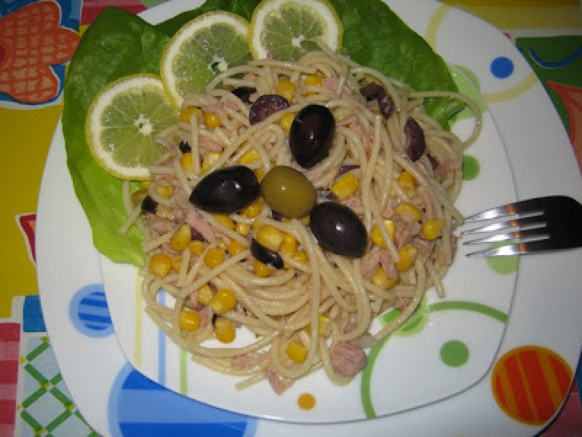 Salata de ton, porumb si paste PrecedentulUrmătorul Felul principalFoarte ușor30 min Trimite unui prieten Printează pagina Adresează o întrebare autorului Postează o poză cu rețeta gătită de tine Aceasta salata e foarte simpla si gustoasa. Ingrediente 2 300 g paste, doua conserve mici de ton in suc propriu, 50 g porumb fiert din conserva, o ceapa, cateva masline negre si verzi fara samburi, ulei de masline, o jumatate de lamaie sare si piper, eventual salata verde pt ornament.