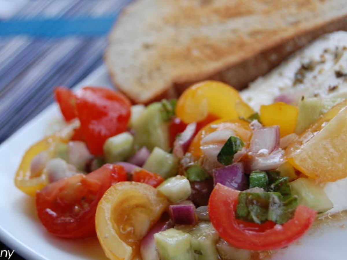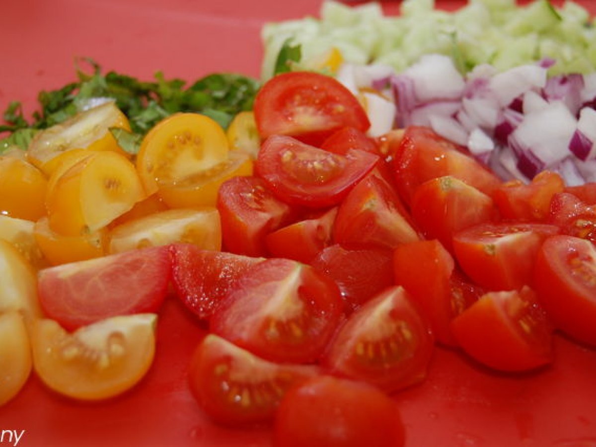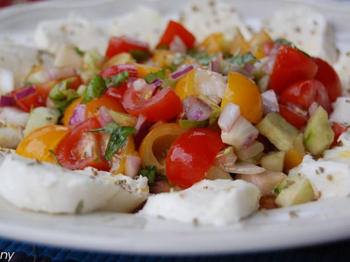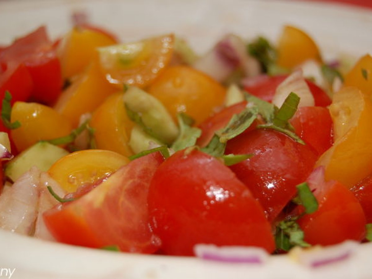 Salata de vara cu mozzarella PrecedentulUrmătorul Felul principalFoarte ușor30 min Trimite unui prieten Printează pagina Adresează o întrebare autorului Postează o poză cu rețeta gătită de tine Ingrediente 2 o mana de rosii cherry rosii o mana de rosii cherry galbene o jumatate de ceapa mov 2 castraveti o manuta de frunze proaspete de busuioc ulei de masline otet balsamic sare oregano uscat 250 de g de mozzarella in zer