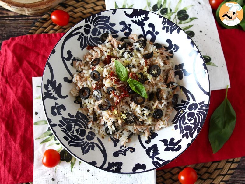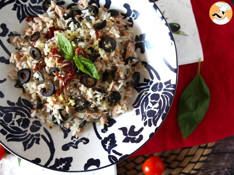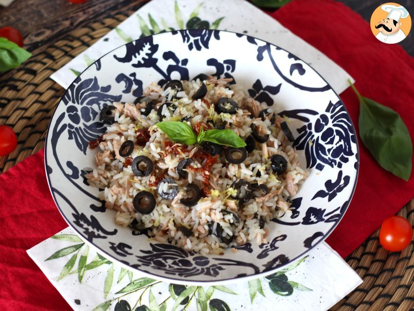 Salată mediteraneană de orez: ton, măsline, roșii uscate și lămâie