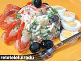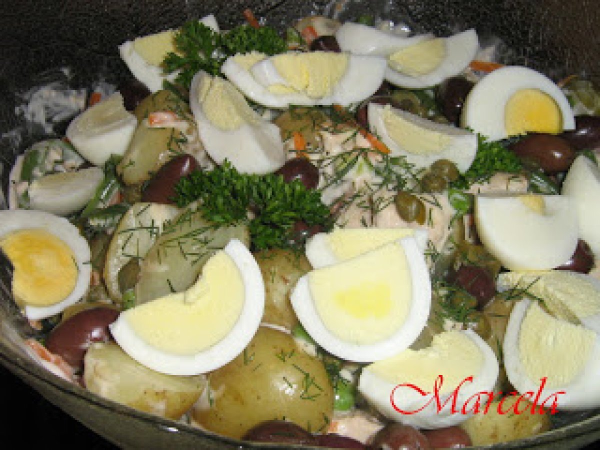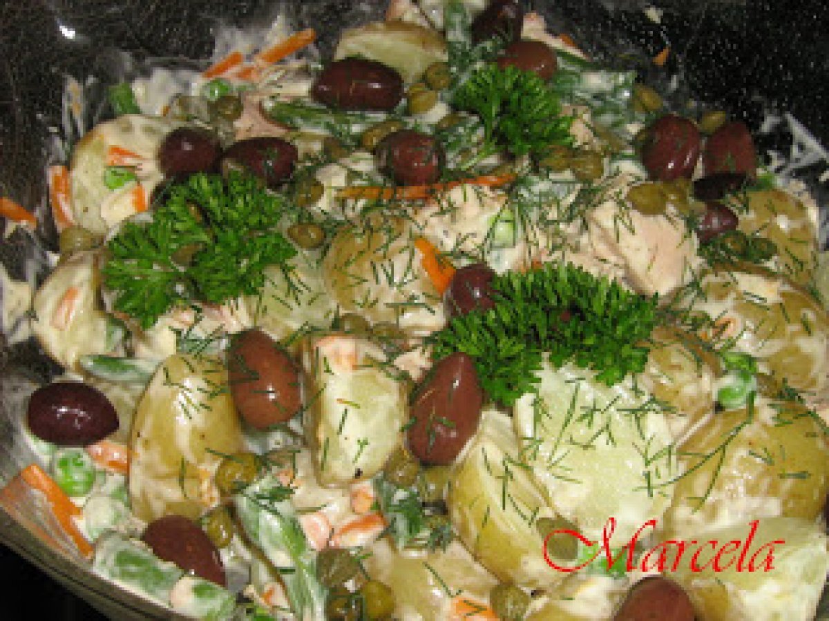 Salata ruseasca PrecedentulUrmătorul Felul principalFoarte ușor50 min Trimite unui prieten Printează pagina Adresează o întrebare autorului Postează o poză cu rețeta gătită de tine Ingrediente 4 2 oua fierte tari 500 g cartofi noi taiati in jumatati sau sferturi 115 g fasole verde taiata bucati mici 115 g mazare congelata 115 morcovi taiati fasii 200 g ton(in conserva) 8 g maioneza 2 linguri suc de lamaie 1-2 catei usturoi zdrobiti 4 castraveciori murati(in otet)- taiati felii 1-2 linguri capere masline negre patrunjel pt. decor 1 g. marar taiat marunt sare si piper