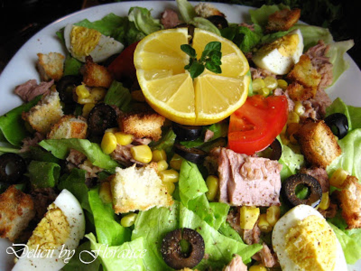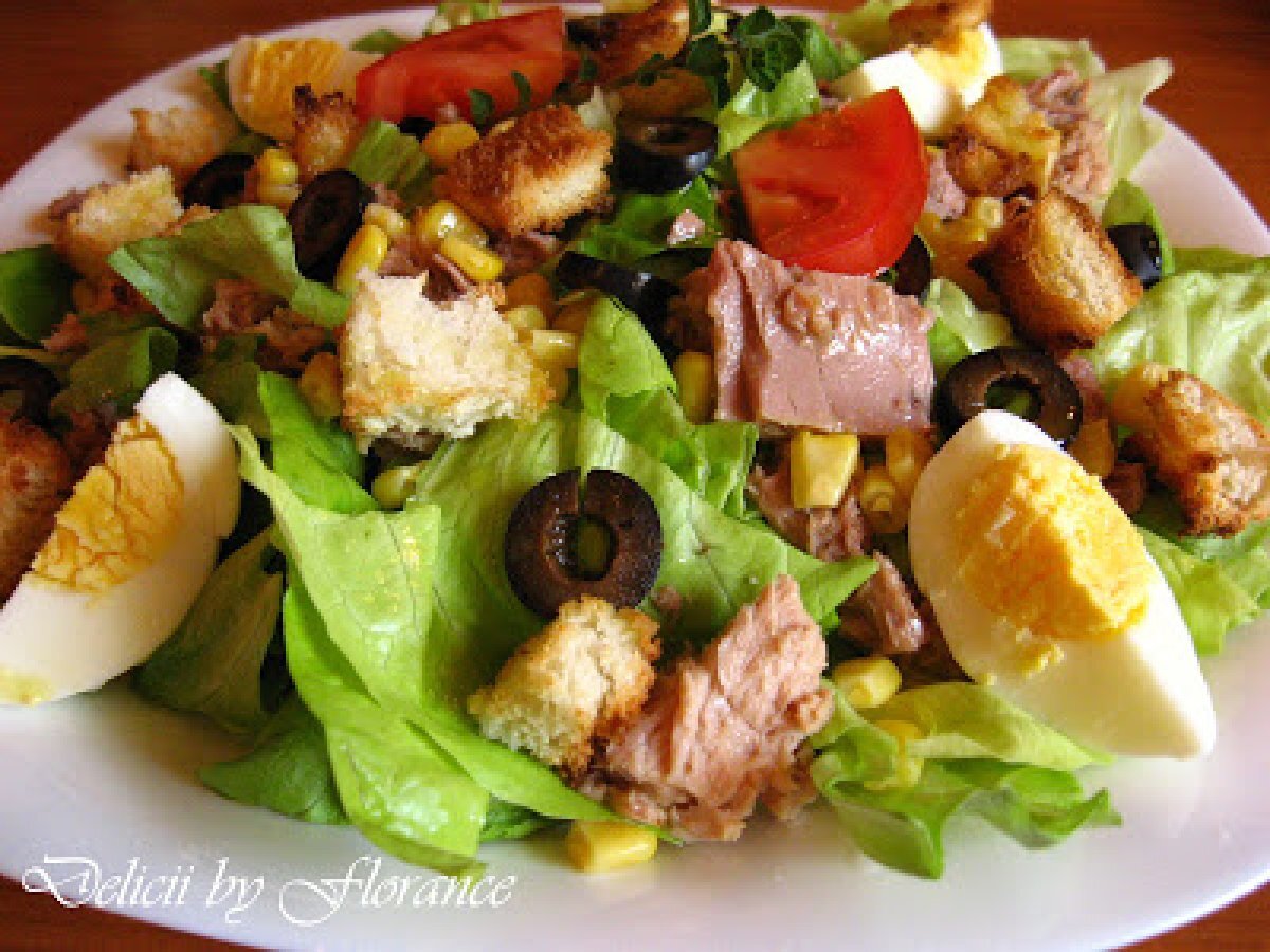 Salata verde cu ton si crutoane PrecedentulUrmătorul Felul principalFoarte ușor30 min Trimite unui prieten Printează pagina Adresează o întrebare autorului Postează o poză cu rețeta gătită de tine Ingrediente 2 1 conserva de ton 1 salata mare 2 oua fierte 75 g porumb dulce din conserva paine prajita (crutoane) 1 lamaie masline sare, piper ulei de masline
