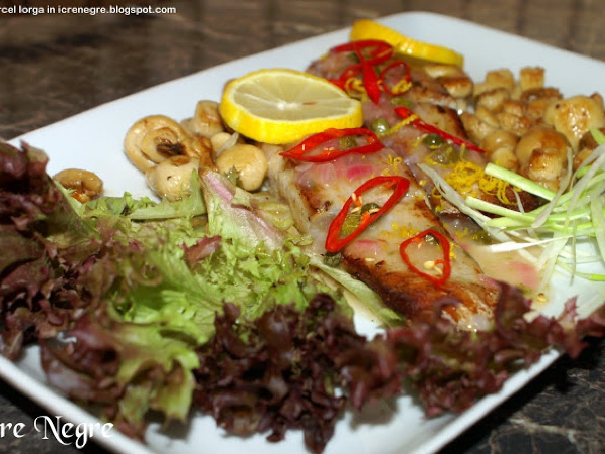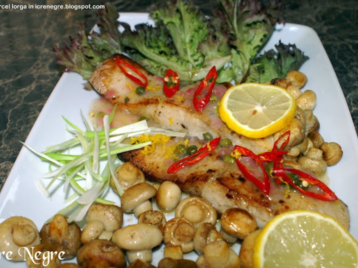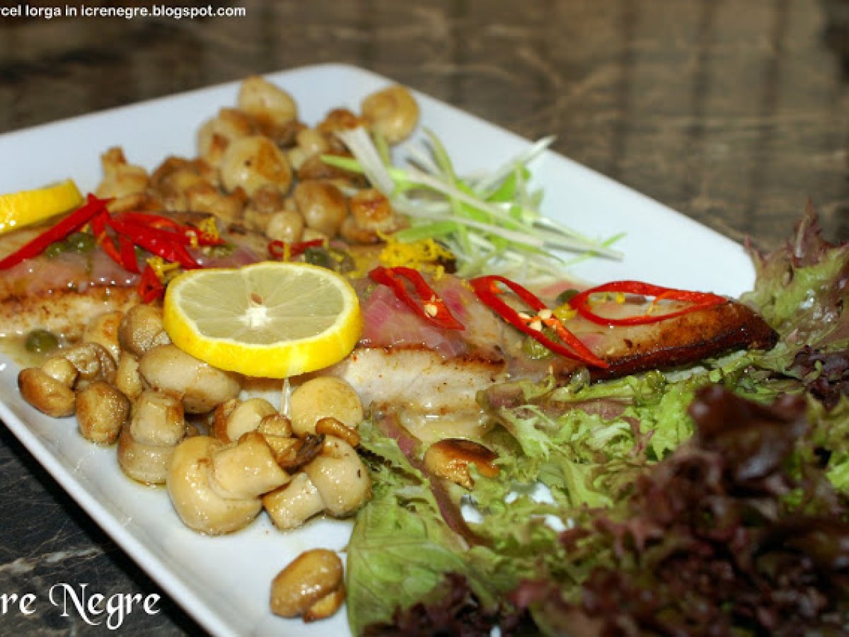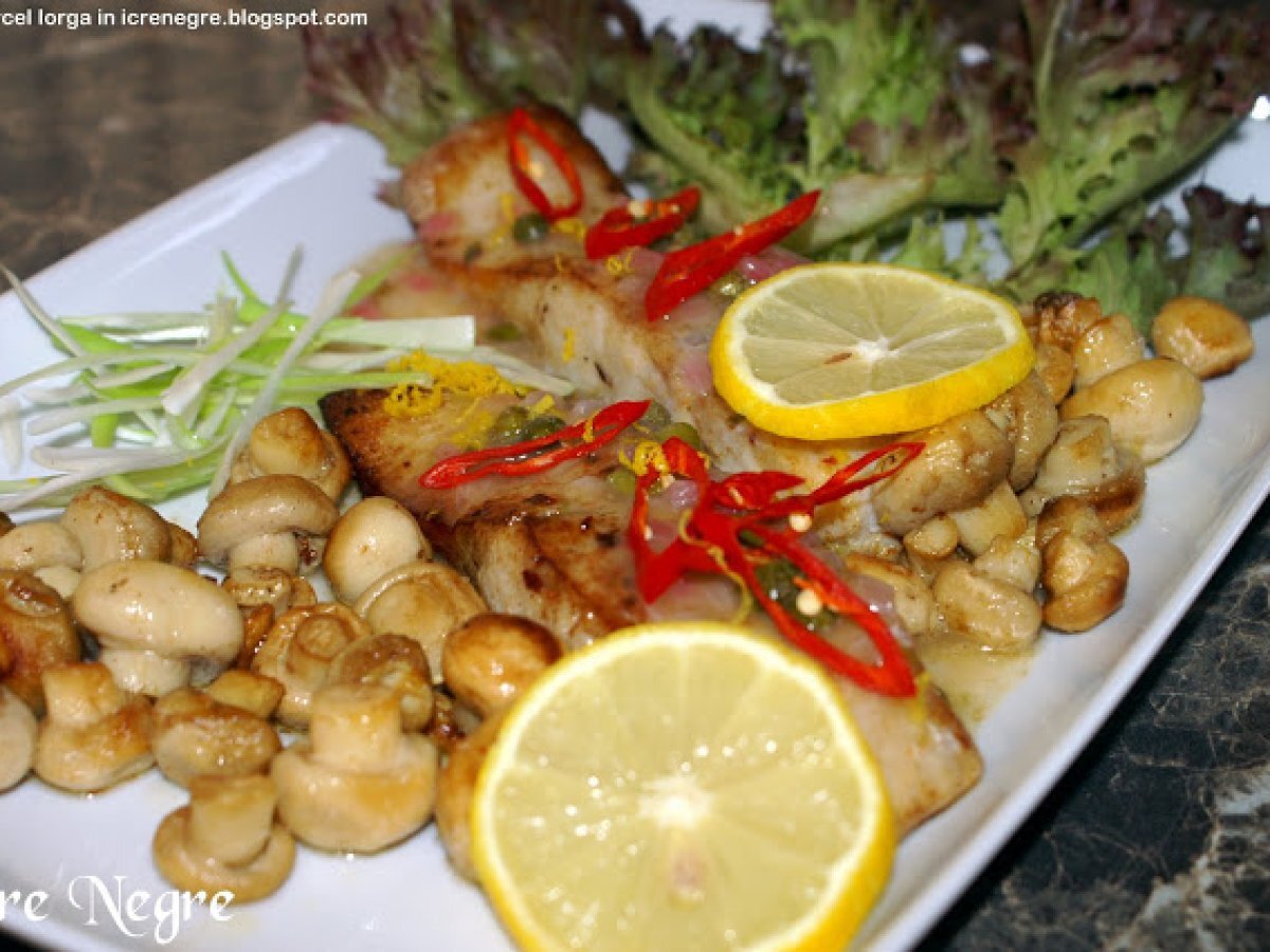 Salau de nil cu sos de capere PrecedentulUrmătorul Felul principalFoarte ușor45 min Trimite unui prieten Printează pagina Adresează o întrebare autorului Postează o poză cu rețeta gătită de tine Ingrediente 6 1 fileu de Salau de Nil din care portionati 2 bucati bune in gramaj total de 200 g 1 borcanas de ciuperci champignon intregi de aprox 250-280 g 1 lingura de capere 100 g de unt 1 lingura de ulei de masline 1/2 ceapa rosie tocata marunt 50 ml de vin alb sec 1 lingurita de amidon, stins in 2 linguri de apa 1 lamaie, din care 1/2 din lamaie se stoarce sucul, cealalta jumatate se feliaza pentru ornare cateva frunze de salata pentru ornat putina coaja rasa de lamaie pentru ornat 1 ceapa verde taiata firisoare, pentru ornat 1 ardei iute rosu, taiat in rondele in diagonala pentru ornat