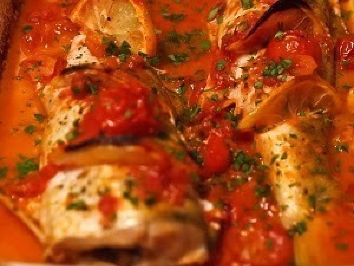 Salau la cuptor PrecedentulUrmătorul Felul principalUșor1 oră Trimite unui prieten Printează pagina Adresează o întrebare autorului Postează o poză cu rețeta gătită de tine Ingrediente 2 2 salai ulei de masline 3-4 catei de usturoi 1 ceasca de vin alb sec 1 cesca sos de rosii 1 mana de rosii cherry patrunjel proaspat sare piper proaspat macinat 1 lamaie
