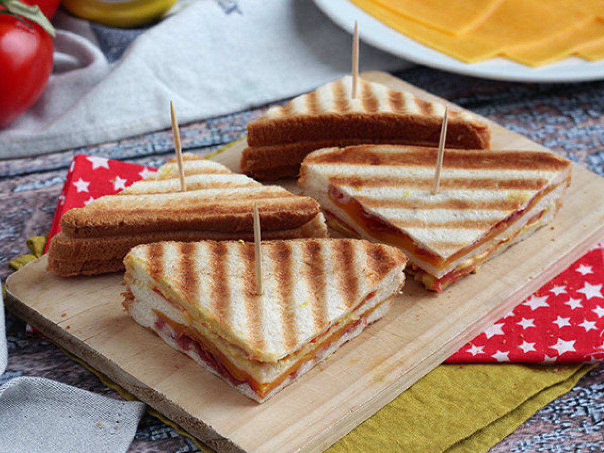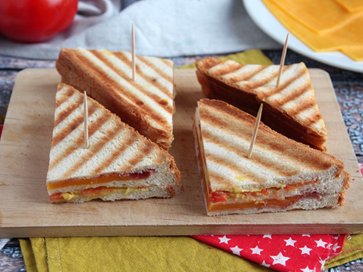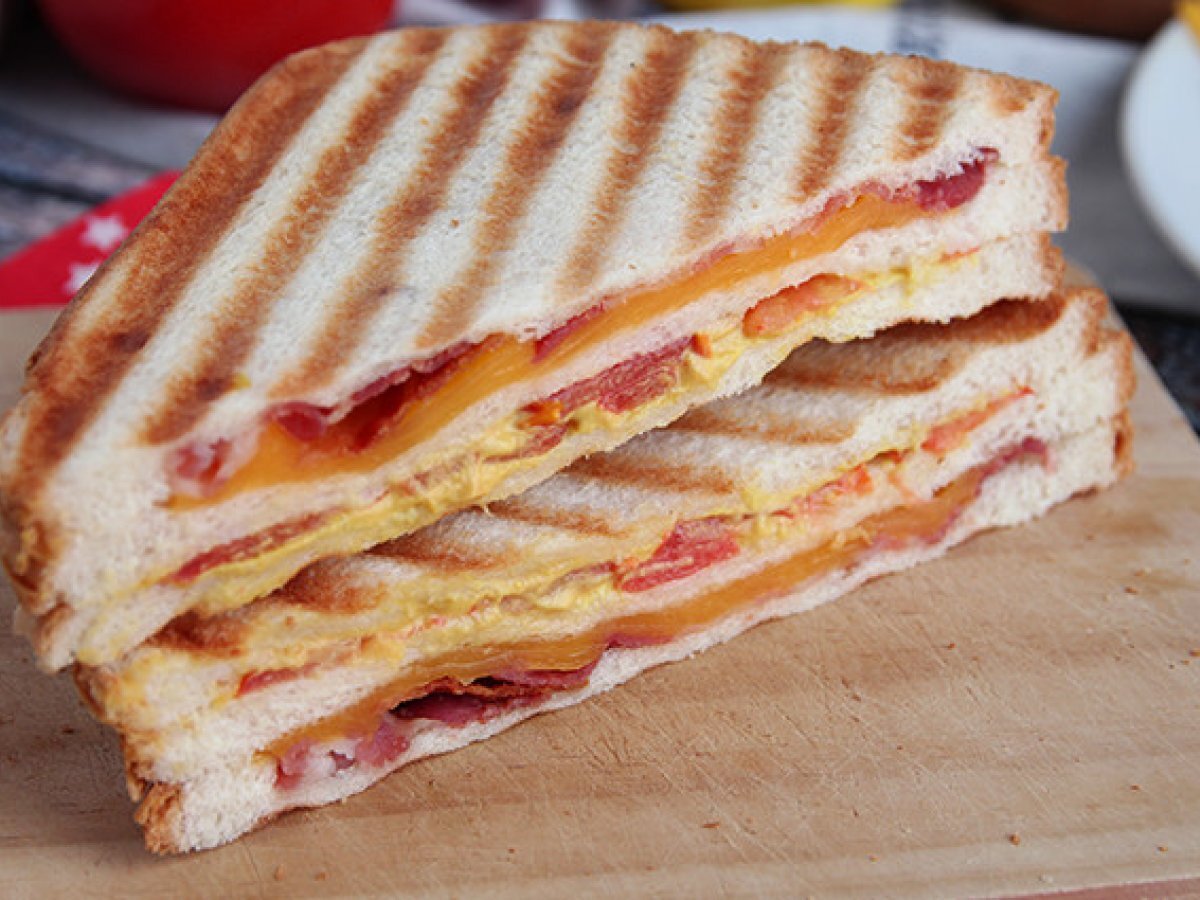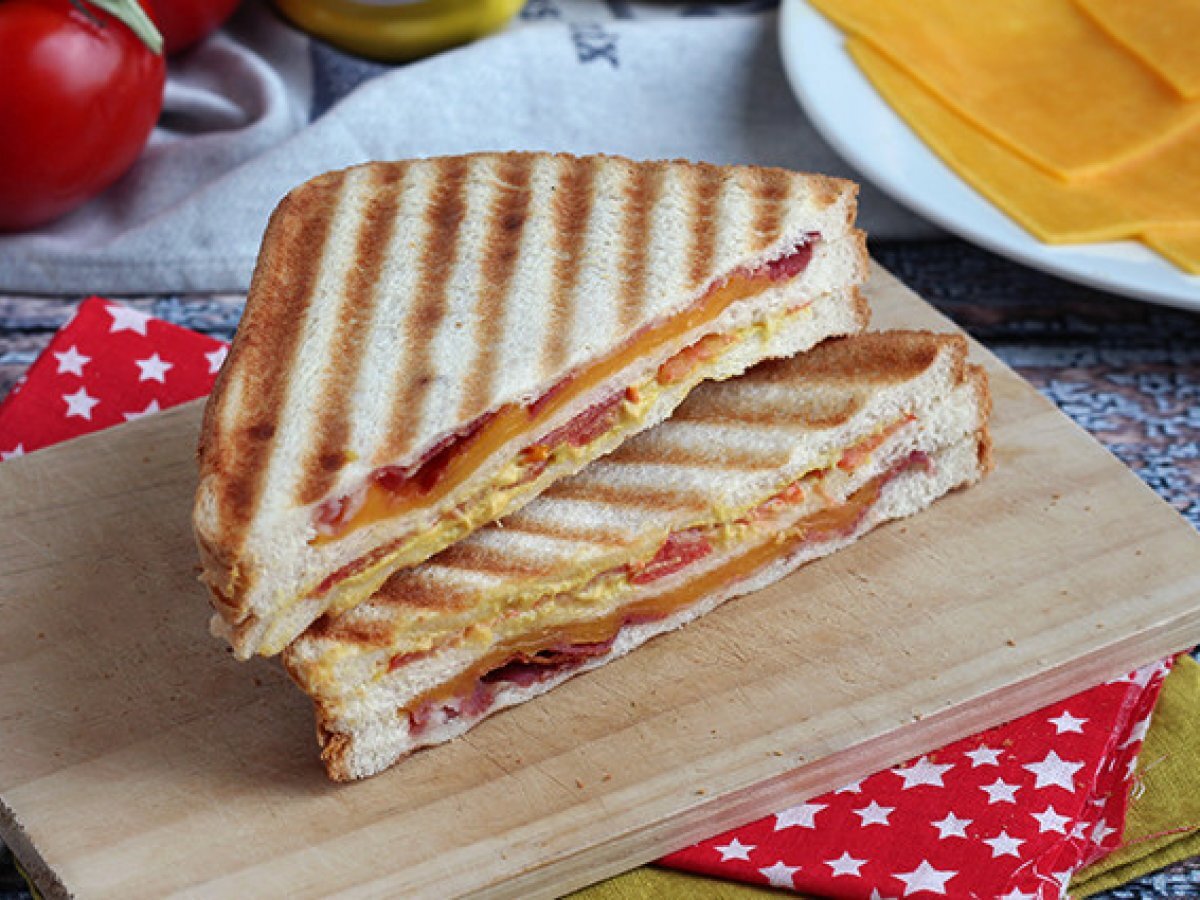 Sandwich club cu arome americane :-) Bacon, cheddar, mustar ... Toate acoperite cu paine prajita. Super usor de facut!