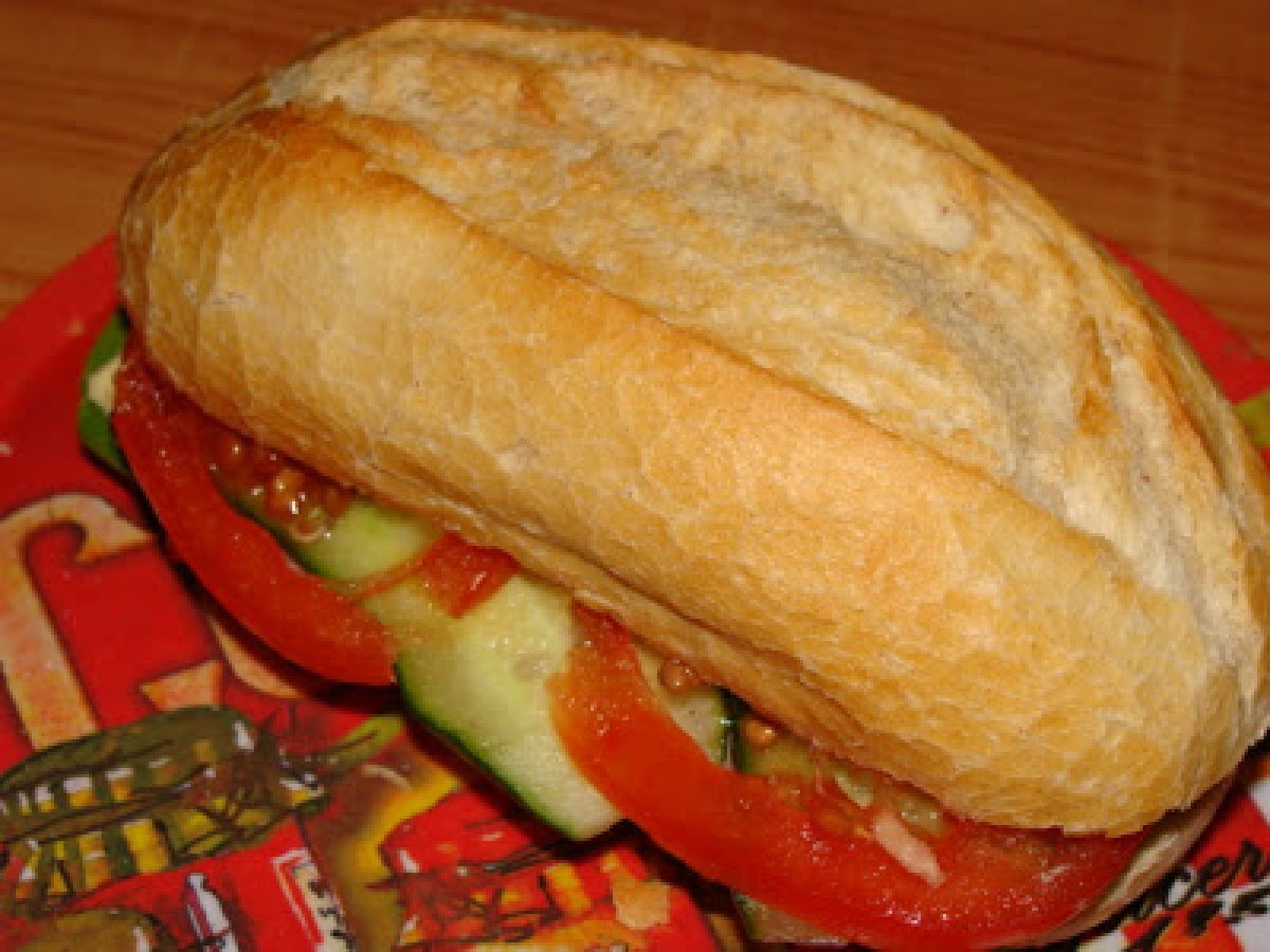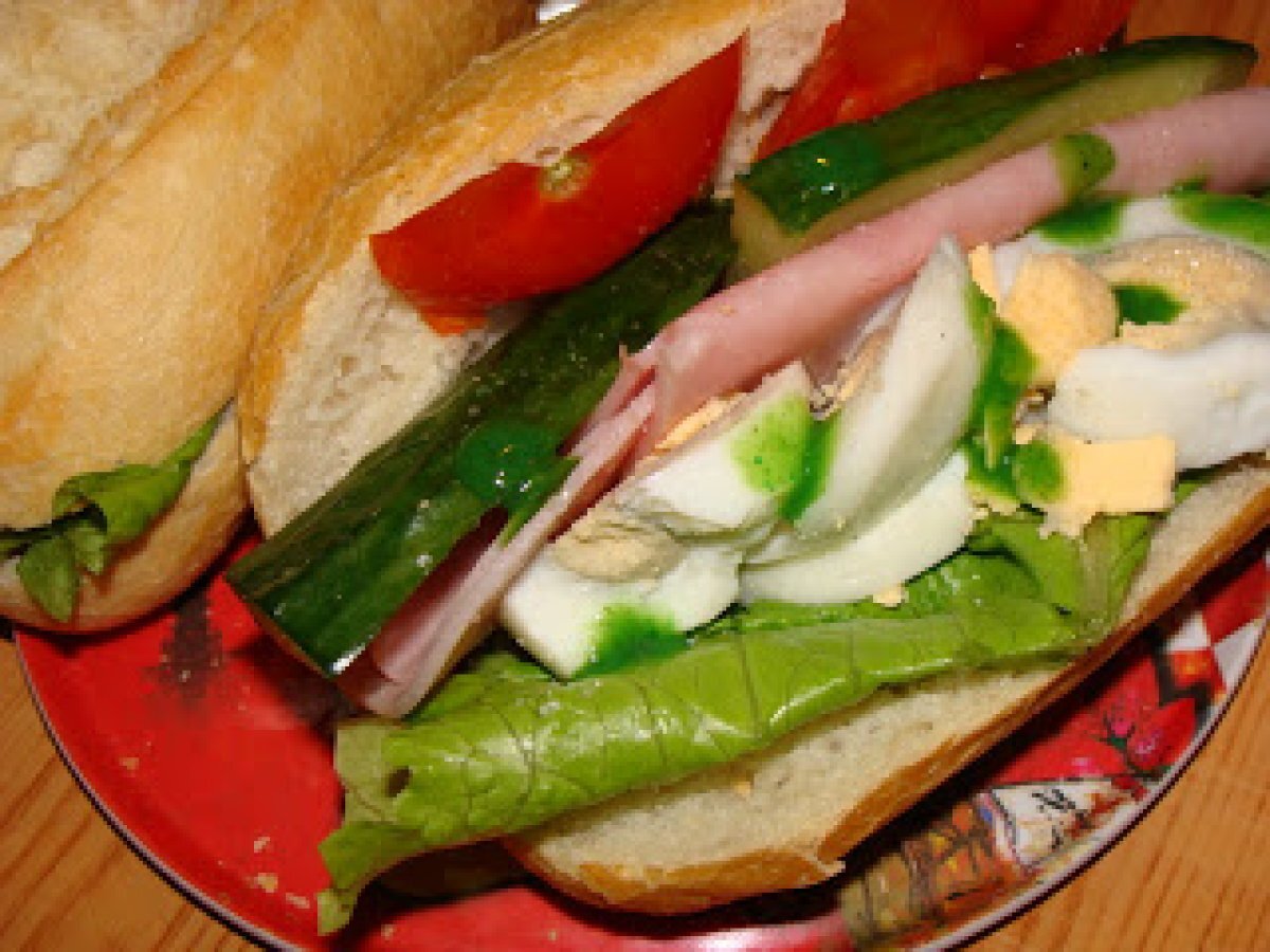 Sandwich cu de toate PrecedentulUrmătorul Felul principalFoarte ușor20 min Trimite unui prieten Printează pagina Adresează o întrebare autorului Postează o poză cu rețeta gătită de tine Ingrediente 4 1 bagheta mica frunze de salata 2 felii de sunca 1 rosie,taiata rondele felii de castraveti 1 ou fiert tare,taiat rondele sos de ardei iute sare,piper
