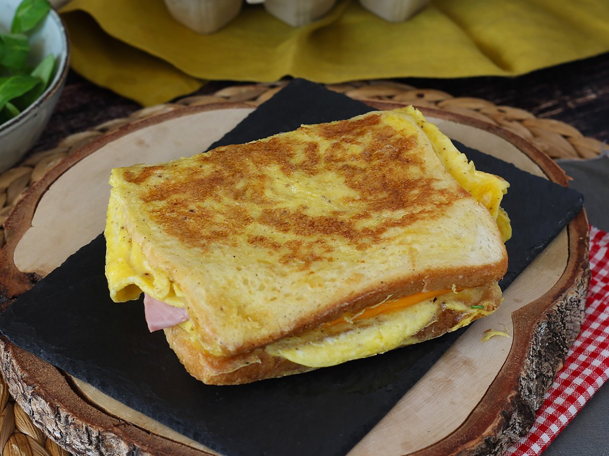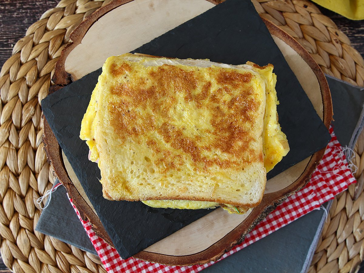Pe omleta se aseaza cele doua felii de paine sandvis si intoarceti-le imediat. Gatiti inca 2 minute si intoarceti omleta.