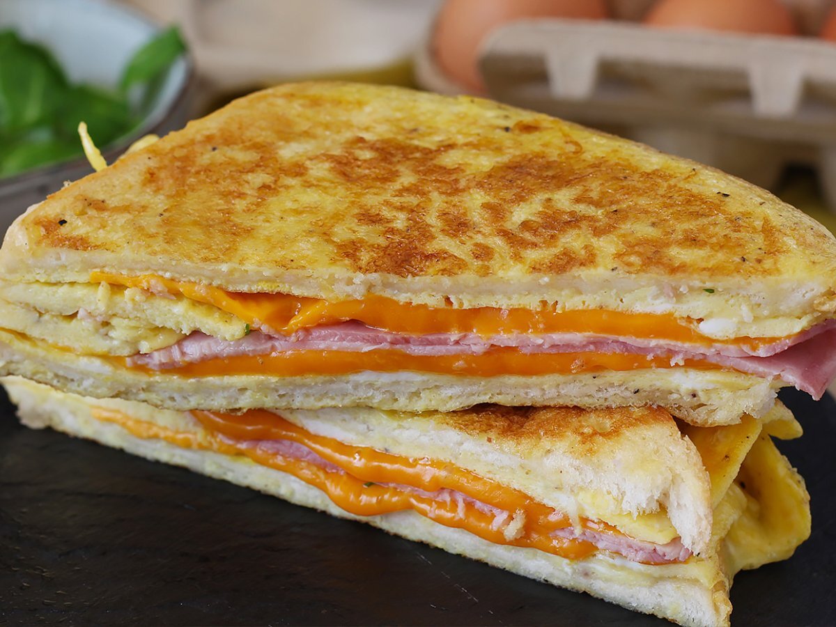 Pentru un brunch am gasit reteta perfecta: un sandvis pe baza de omleta! Mai original decat clasicele friganele si la fel de usor/rapid de preparat ;-) Plin cu sunca si bineinteles cu felii de cascaval! Pe gustul intregii familii!