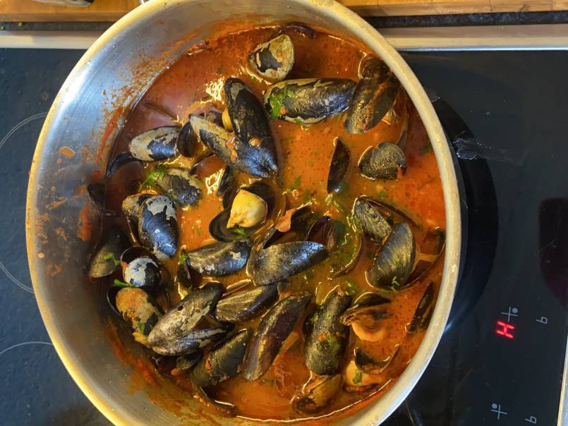 Scoici in sos de rosii PrecedentulUrmătorul Felul principalFoarte ușor40 min Trimite unui prieten Printează pagina Adresează o întrebare autorului Postează o poză cu rețeta gătită de tine Ingrediente 2 1/2 kg de scoici 2 linguri ceapa razuita sare si piper 2 foie de dafin 4 catei de usturoi 4 linguri ulei de masline 5 rosii 1 lingura pasta de rosii 1 pahar de apa 1 lingura de patrunjel tocat