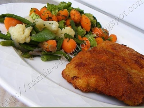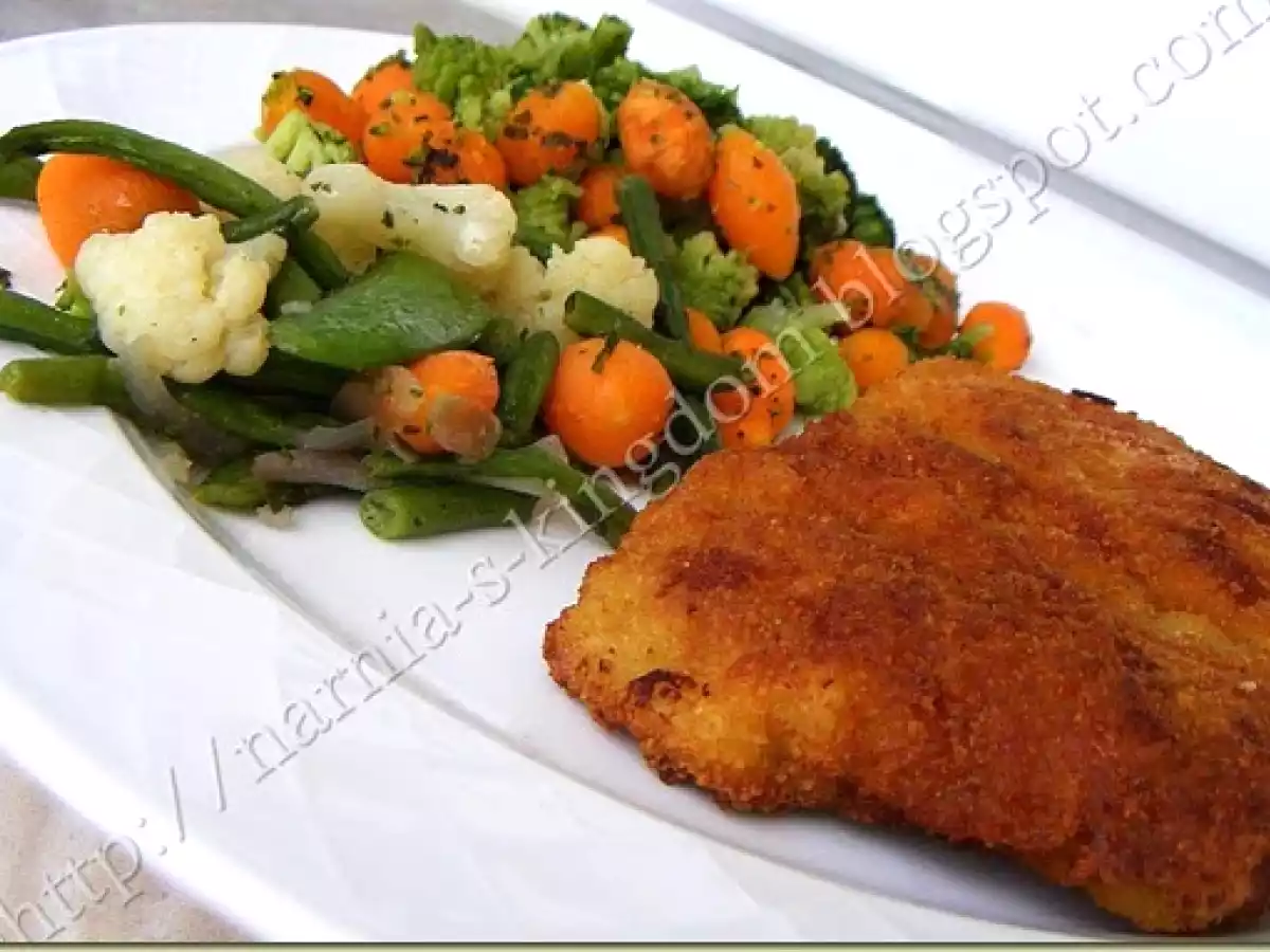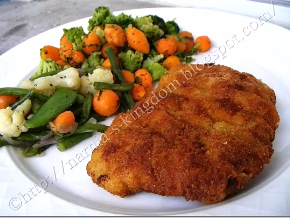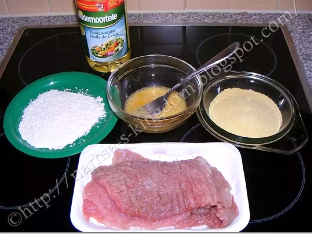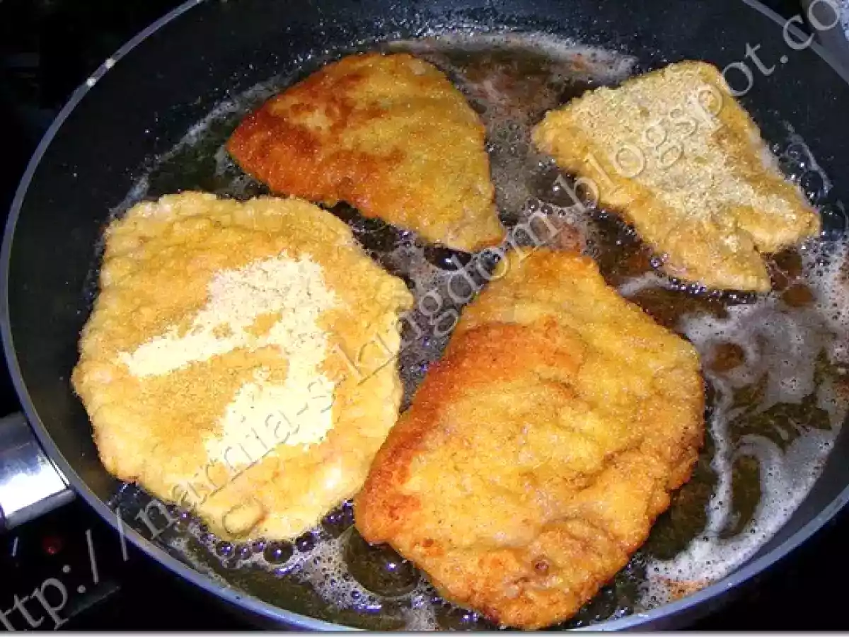 Snitel de porc ? tip vienez PrecedentulUrmătorul Felul principalFoarte ușor40 min Trimite unui prieten Printează pagina Adresează o întrebare autorului Postează o poză cu rețeta gătită de tine Ingrediente 4 4 bucati de carne de porc 2 oua, faina pesmet sare piper ulei pentru prajit.