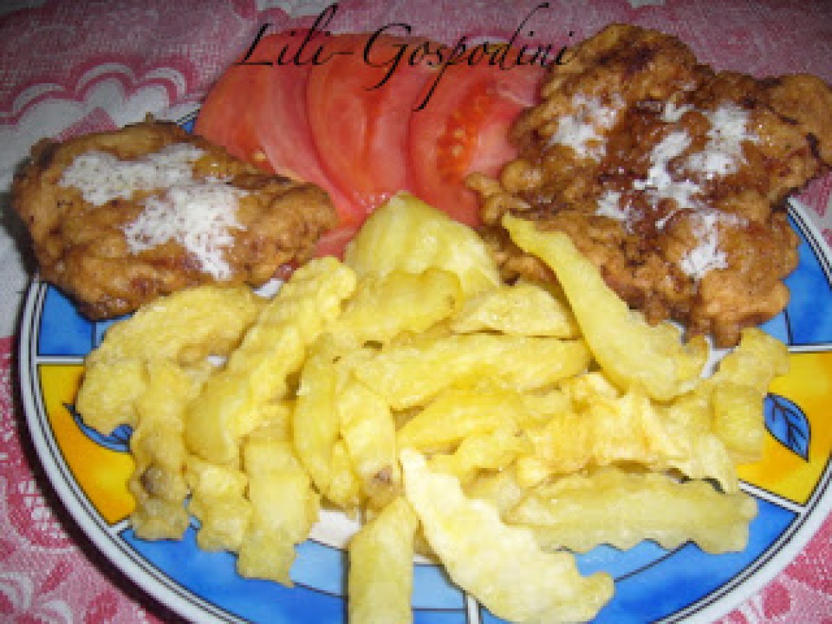 Snitele de porc cu cartofi pai (opariti) Felul principalFoarte ușor40 min Trimite unui prieten Printează pagina Adresează o întrebare autorului Postează o poză cu rețeta gătită de tine Ingrediente 4 500 g carne de porc 100 ml lapte 4-5 oua faina un pahar apa minerala usturoi sare,piper