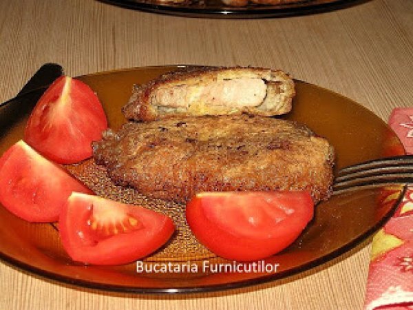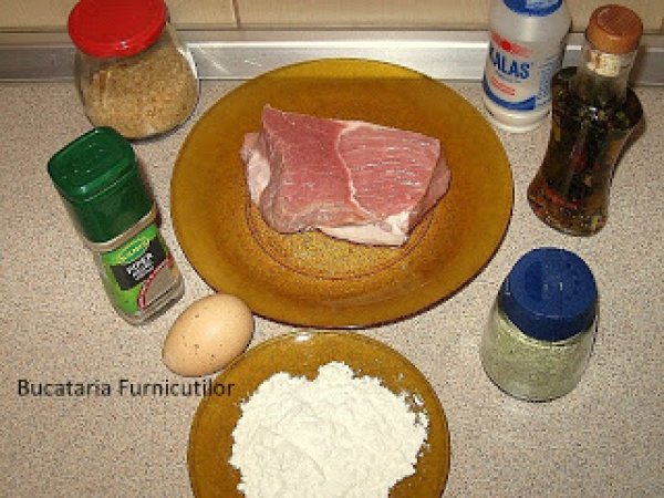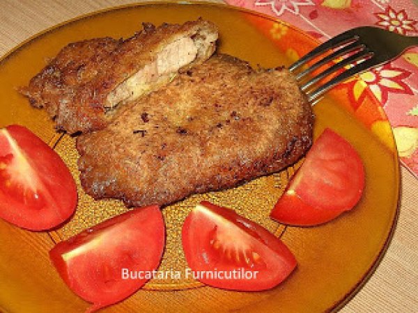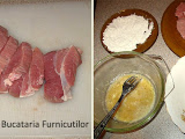 - Taiem carnea de-a latul fibrelor in bucati potrivit de mari si nu prea groase. Bucatile obtinute se bat cu ciocanul de snitele cu grija ca sa nu se rupa carnea.Intr-un vas batem ouale ca pentru omleta, punem sare si piper. Adaugam 2 lingurita de faina, pentru ca sa obtinem un amestec de consistenta unei smantani. In alt vas amestecam pesmetul cu 1 lingura de faina si rosmarin. Ambele vase trebuie fie suficient de late pentru ca sa incapa snitelele in ele.Ne pregatim frontul de lucru: asezam una langa alta: o farfurie cu faina (ce a ramas din cele 3-4 linguri), farfuria cu ou si farfuria cu pesmet.