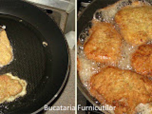 - Punem la incins tigaia cu ulei si incepem operatiunea snitelul: luam o bucata de carne, o dam prin faina simpla, prin ou, prin pesmet si apoi iar prin ou. Imediat cum am terminat de dat prin ou a doua oara, punem snitelul in tigaie. Continuam asa cu cate snitele ne incap in tigaie, avand grija sa nu se arda cele pe care le-am pus la inceput. Cel mai usor este sa tineti bucata de carne cu o furculita pentru ca sa se acopere cu ou si pesmet pe toata suprafata. In plus asa ramaneti cu mainile curate.