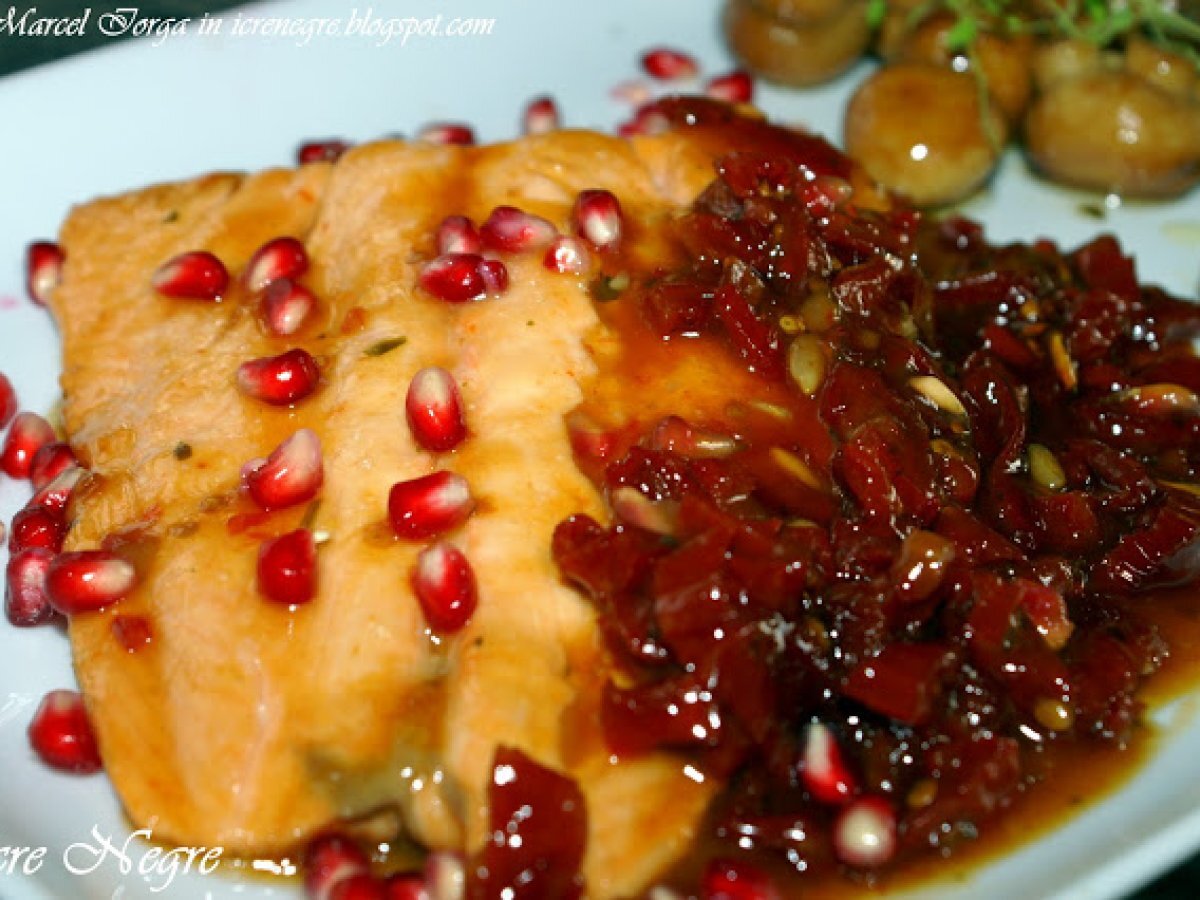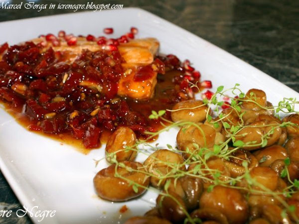 Somon , cu sos de rodii, rosii uscate si ciuperci PrecedentulUrmătorul Felul principalFoarte ușor50 min Trimite unui prieten Printează pagina Adresează o întrebare autorului Postează o poză cu rețeta gătită de tine Ingrediente 4 1 fileu de somon de circa 250g 3-4 bucatele de rosii uscate marinate 2-3 linguri de sos dulce de chilli 1 borcanas de ciuperci champignon intregi 100 ml de vin alb sec 50g unt 1 lingura de ulei de masline 1 rodie 1/2 lingurita de otet de orez 1/2 lingurita de sos de soia sare piper