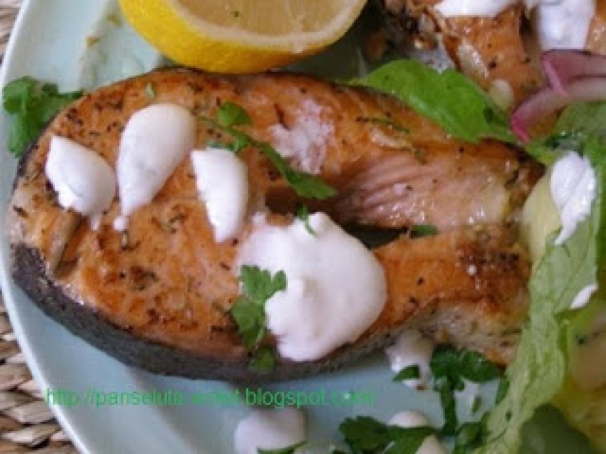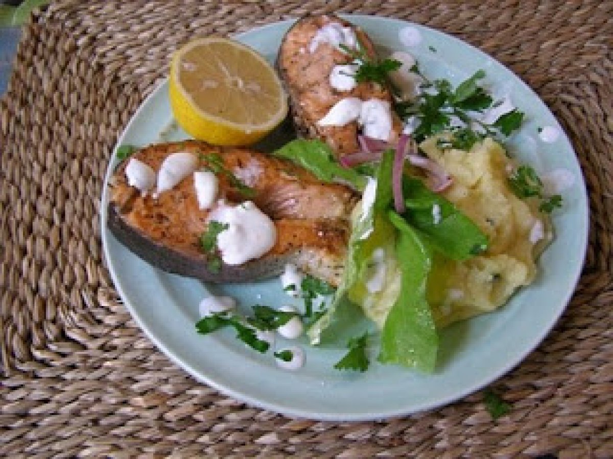 Somon la gratar cu sos de smantana si piureul meu PrecedentulUrmătorul Felul principalFoarte ușor35 min Trimite unui prieten Printează pagina Adresează o întrebare autorului Postează o poză cu rețeta gătită de tine Ingrediente 2 somon ulei de masline zeama d a 1/2 lamaie o lingurita de rozmarin uscat daca nu aveti proaspat 3 - 4 catei de usturoi sare piper 200 g smantana 4 catei de usturoi sare piper patrunjel tocat