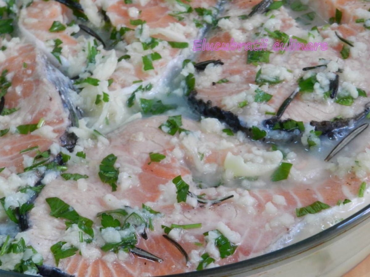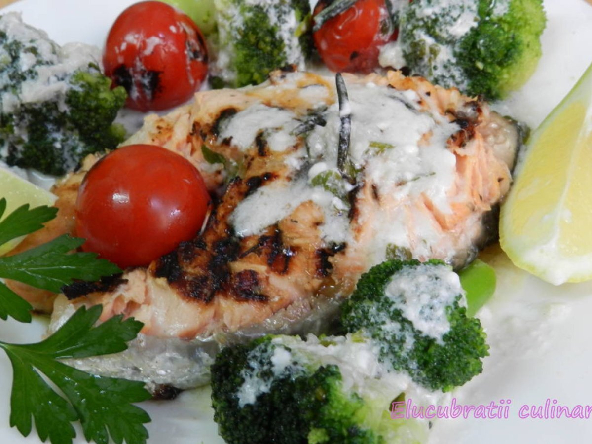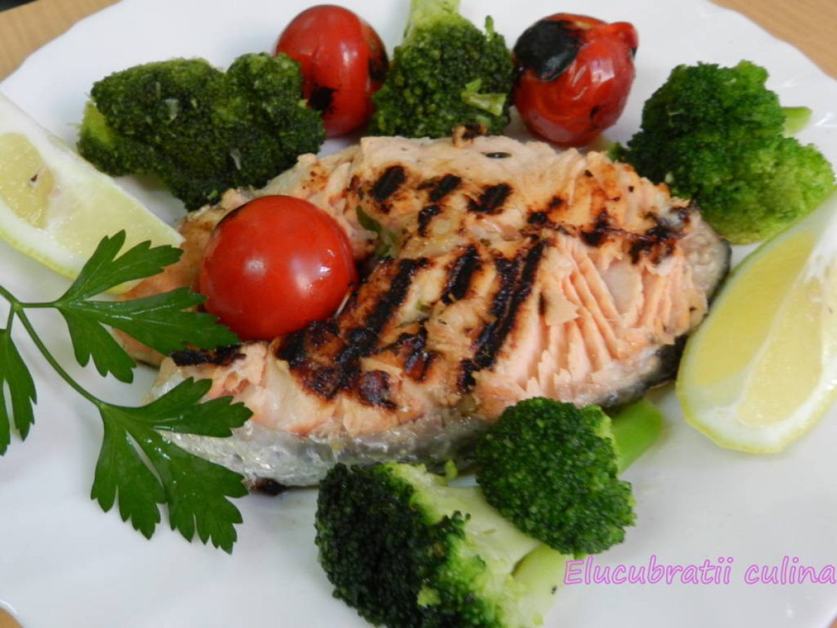 Somon marinat la grătar PrecedentulUrmătorul Felul principalUșor45 min Trimite unui prieten Printează pagina Adresează o întrebare autorului Postează o poză cu rețeta gătită de tine cu legume... Ingrediente 4 4 medalioane de somon, 1 căpățână usturoi, zeama de la 2 lămâi mari, 3 linguri ulei de măsline, 1-2 crenguțe de rozmarin, 1 lingură pătrunjel proaspăt tocat, 200 ml vin alb, sare, piper. Sos: sosul de la marinată, 2 linguri unt, 2-3 linguri iaurt gras. Garnitură: Roșii cherry la grătar, Broccoli călit în unt.