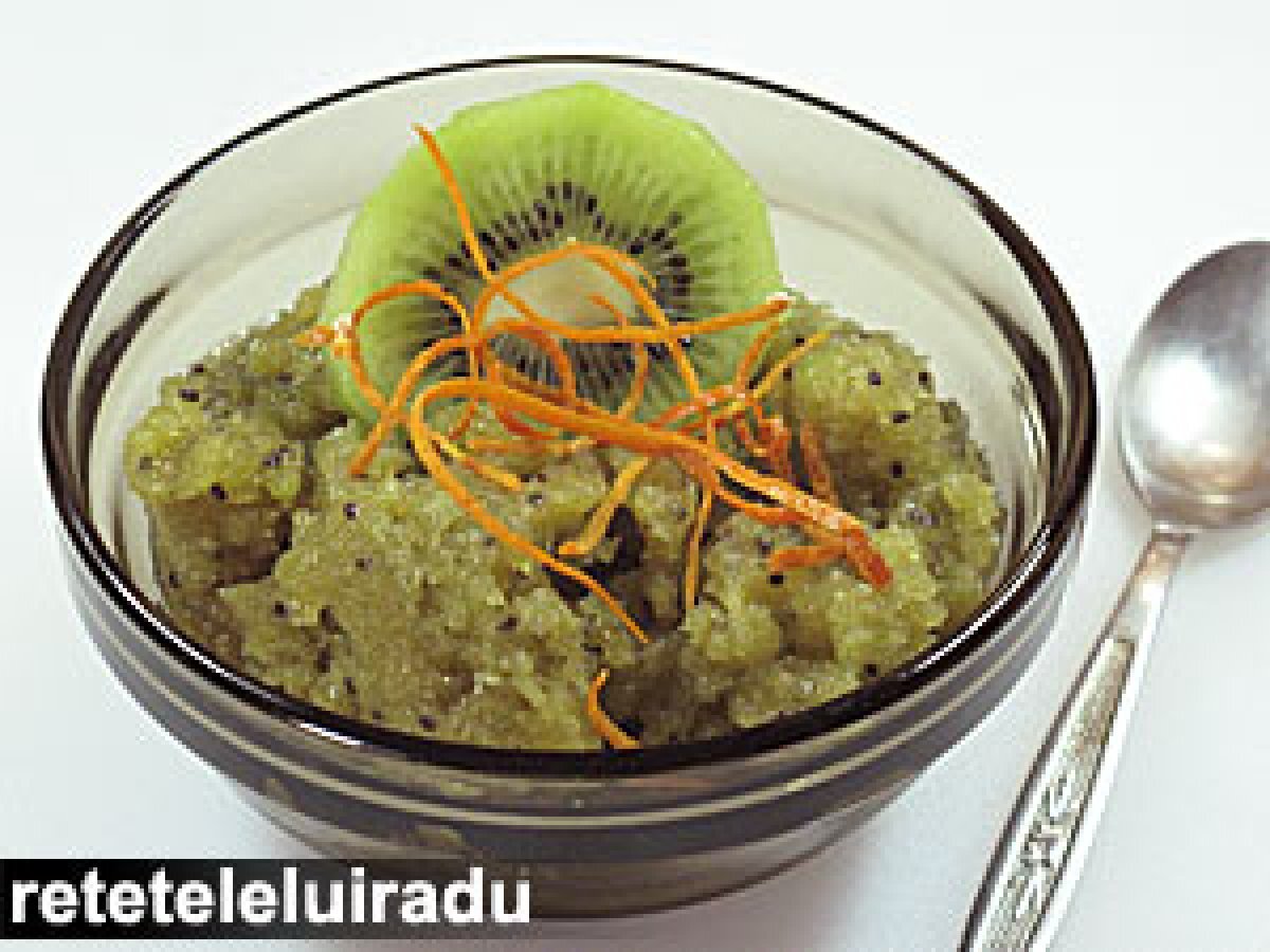 Sorbet de kiwi cu ghimbir Felul principalFoarte ușor40 min927 Kcal Trimite unui prieten Printează pagina Adresează o întrebare autorului Postează o poză cu rețeta gătită de tine Ingrediente 1 60 g zahar de trestie (sau zahar brun) 8 kiwi, curatate 6 linguri de suc de portocale 2 cm bucati de ghimbir, dat prin rizotoare 1 kiwi mare, curatat si taiat rondele firisoare subtiri de coaja de portocale Cost estimat: 4.49Euros€ (4.49€/porție)