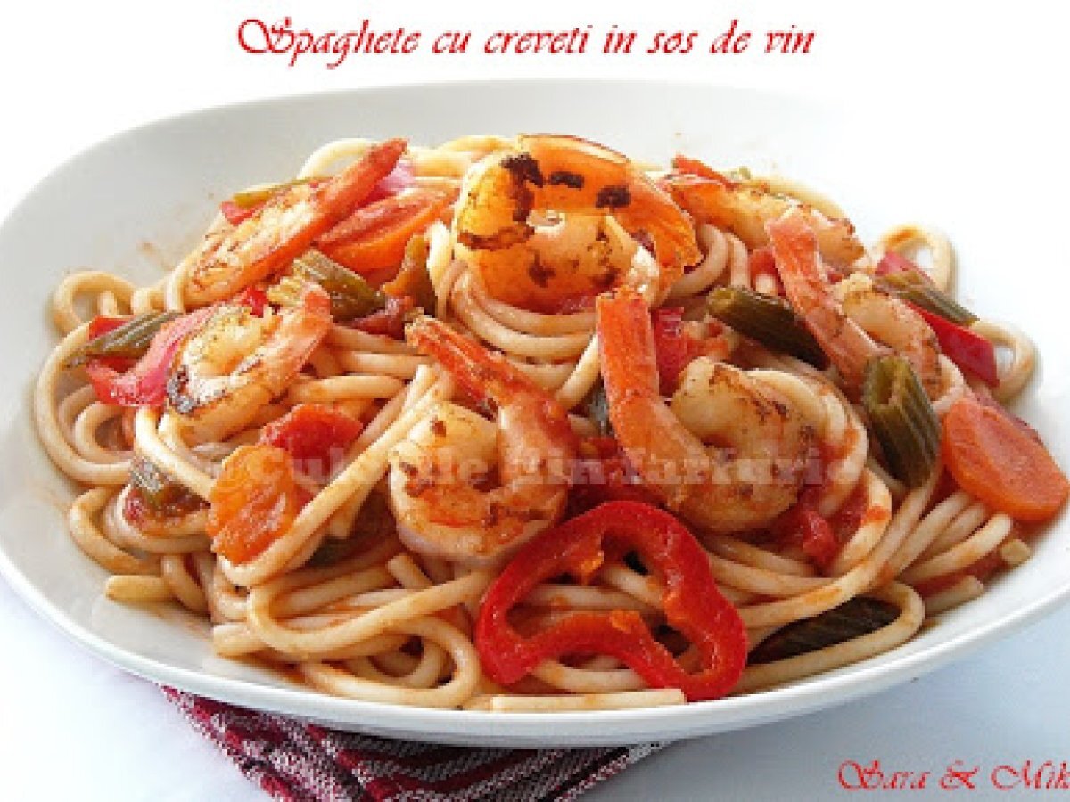 Spaghete cu creveti in sos de vin PrecedentulUrmătorul Felul principalFoarte ușor35 min Trimite unui prieten Printează pagina Adresează o întrebare autorului Postează o poză cu rețeta gătită de tine Ingrediente 4 250 g creveti decorticati 300 g spaghete 2 lg de ulei de masline 2 linguri de unt 1 ceapa verde 2-3 catei de usturoi rosii decojite 100 ml de vin alb oregano 1/2 lamaie sare si piper patrunjel si busuioc tocat