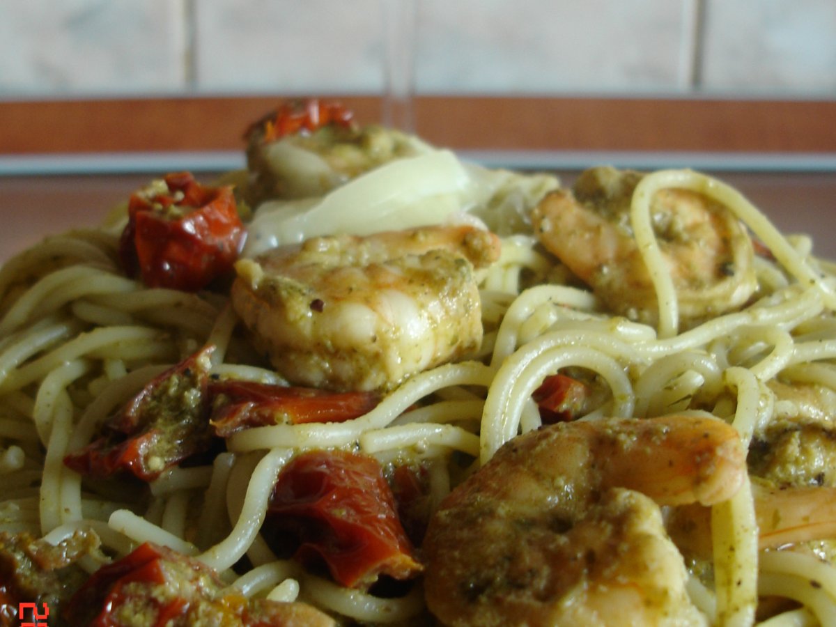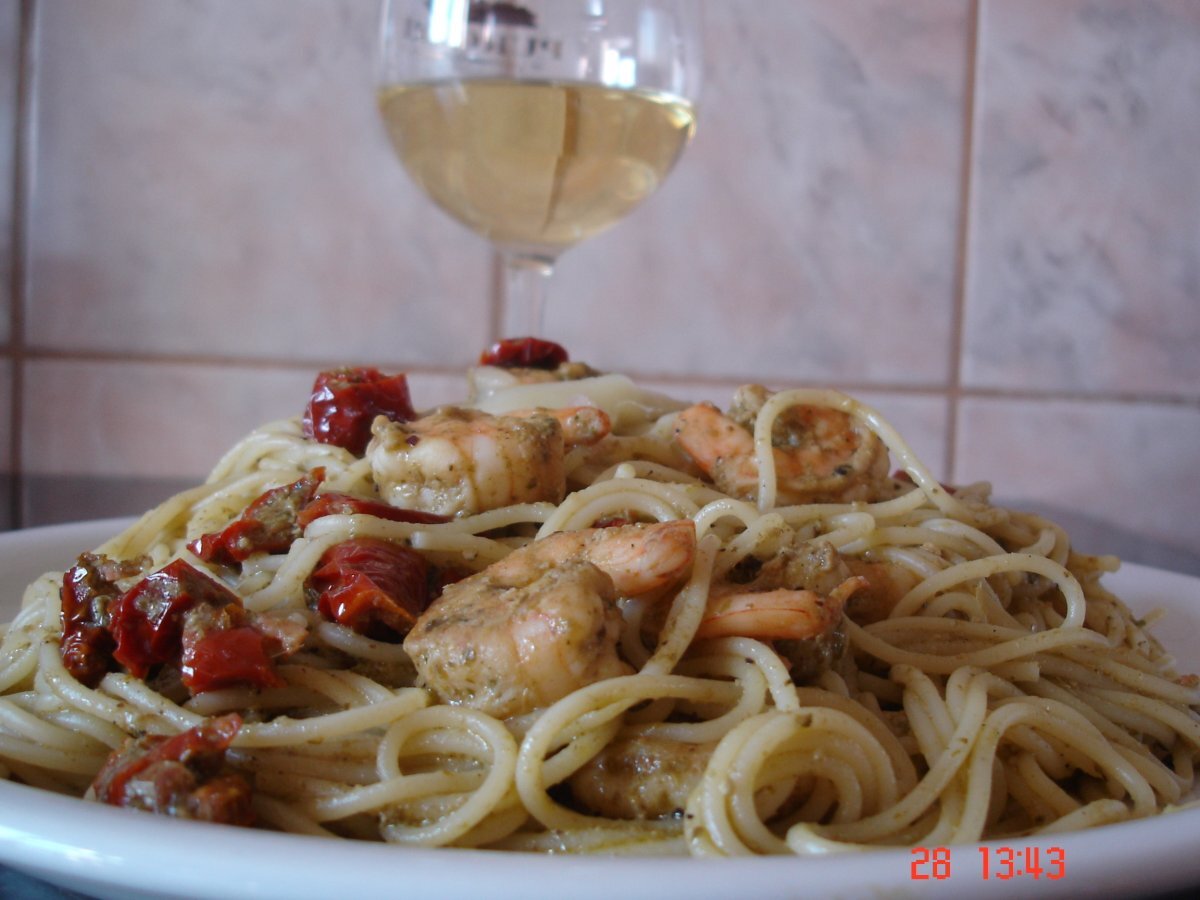 Spaghete cu creveti si pesto PrecedentulUrmătorul Felul principalFoarte ușor15 min Trimite unui prieten Printează pagina Adresează o întrebare autorului Postează o poză cu rețeta gătită de tine Ingrediente 2 8 bucati creveti 2 linguri cu sos pesto 50ml vin alb 5 rosii uscate spaghete