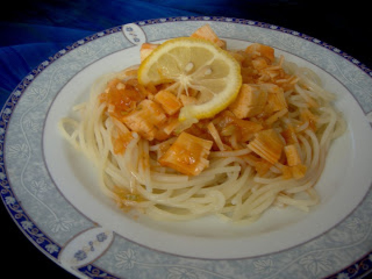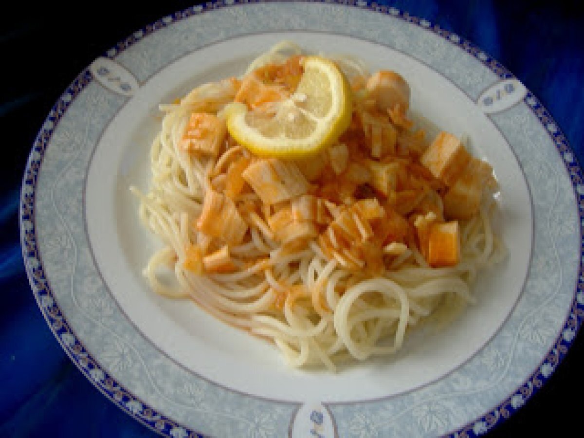 Spaghete cu surimi PrecedentulUrmătorul Felul principalFoarte ușor30 min Trimite unui prieten Printează pagina Adresează o întrebare autorului Postează o poză cu rețeta gătită de tine Ingrediente 2 1 cutie surimi 400 g spaghete 1 lamaie 2 cepe 2 catei usturoi 200 ml vin alb 1/2 ardei iute busuioc, oregano 200 ml suc de rosii