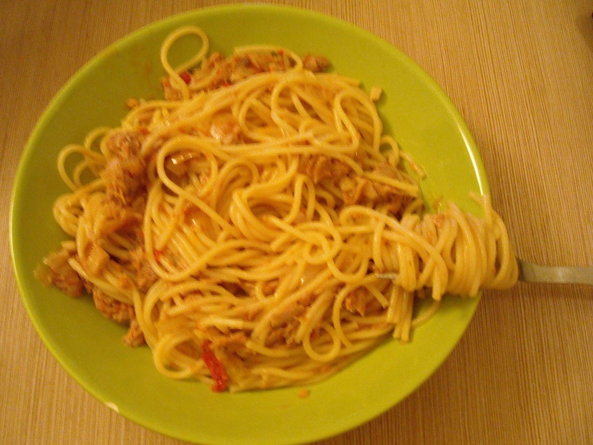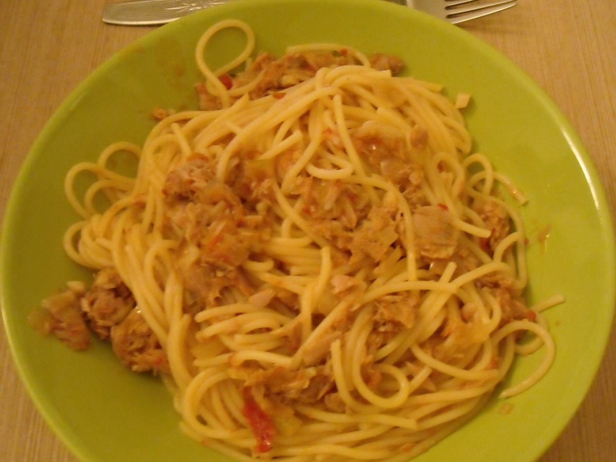 Spaghete picante cu ton PrecedentulUrmătorul Felul principalFoarte ușor30 min Trimite unui prieten Printează pagina Adresează o întrebare autorului Postează o poză cu rețeta gătită de tine Ingrediente 4 o cutie de spaghete 5-6 rosii tocate cubulete (fara pielita) ardei iute ardei gras doi catei de usturoi o ceapa ulei de masline - 5 linguri doua conserve de ton bucati