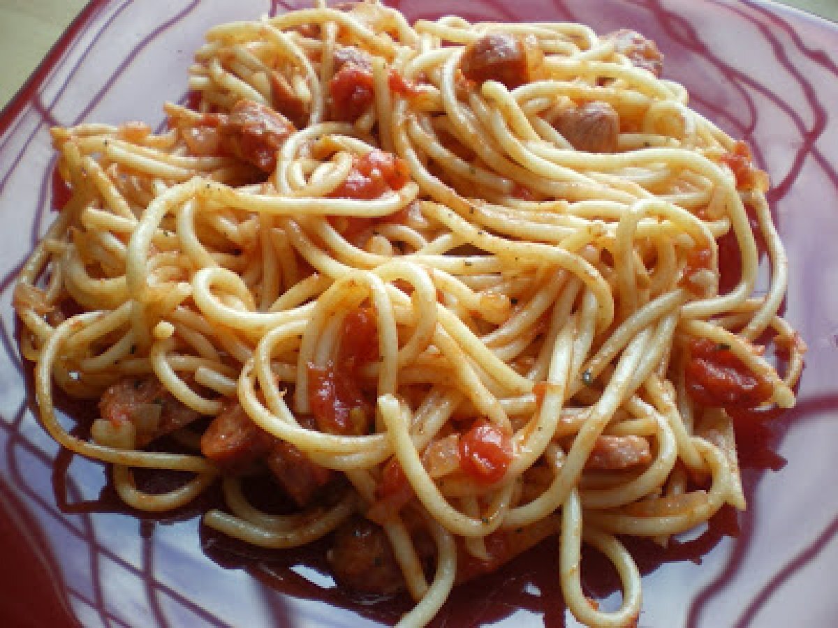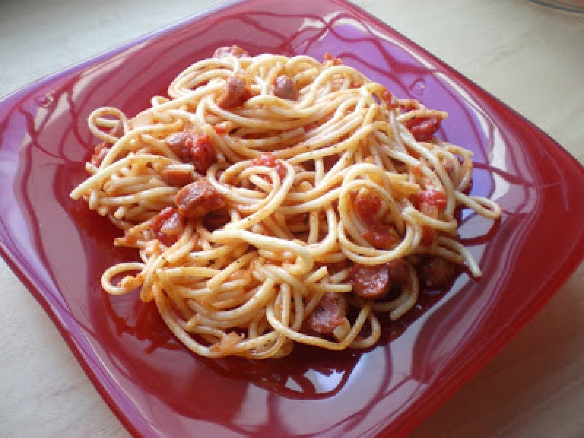 Spaghetti cu carnaciori si sos de rosii PrecedentulUrmătorul Felul principalFoarte ușor25 min Trimite unui prieten Printează pagina Adresează o întrebare autorului Postează o poză cu rețeta gătită de tine Ingrediente 2 200 g carnaciorispaghetti 1 ceapa 3 catei usturoio conserva de rosii 1 lingura pasta de tomate piper.