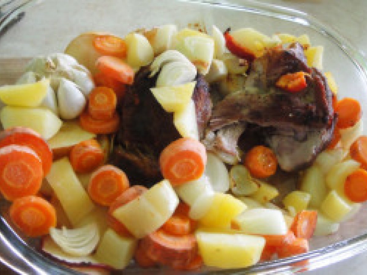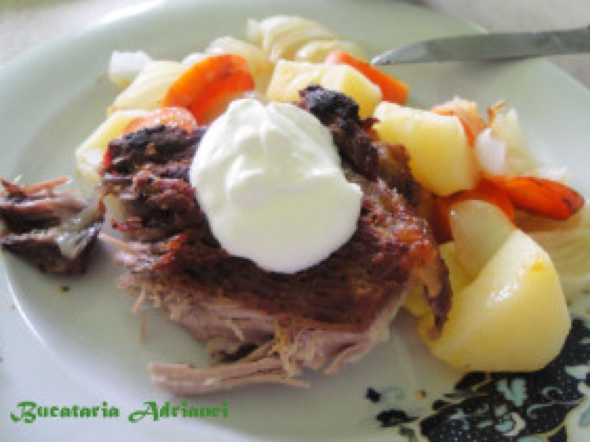 Spata de porc cu cartofi si morcovi PrecedentulUrmătorul Felul principalFoarte ușor40 min Trimite unui prieten Printează pagina Adresează o întrebare autorului Postează o poză cu rețeta gătită de tine Ingrediente 4 900 g- 1 kg de spata de porc sare/piper dupa gust 3 morcovi 3 cartofi mari 1 ceapa taiata mare 1 vin alb 2 catei de usturoi