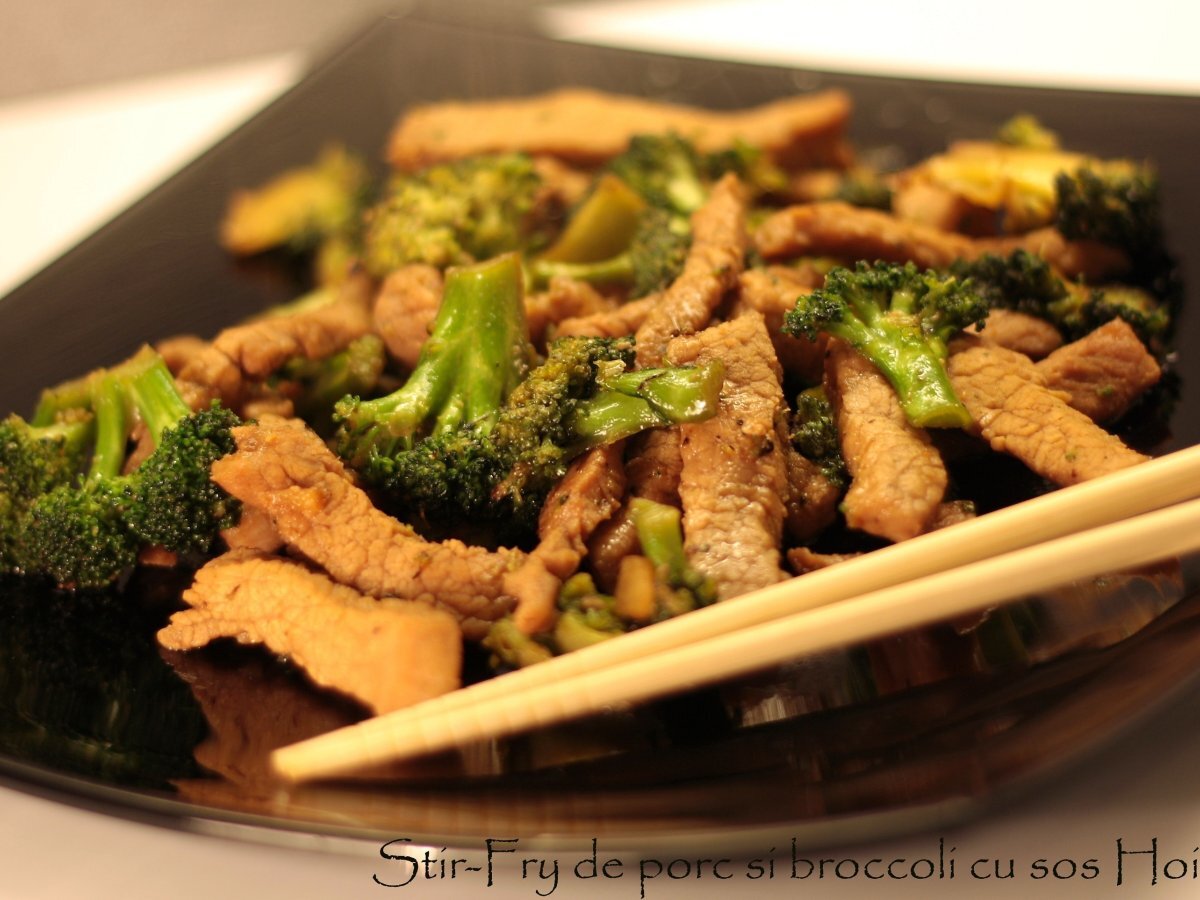 Stir-fry de porc si broccoli cu ghimbir si sos hoisin PrecedentulUrmătorul Felul principalFoarte ușor25 min Trimite unui prieten Printează pagina Adresează o întrebare autorului Postează o poză cu rețeta gătită de tine Ingrediente 3 500 g muschi de porc 4 catei usturoi 4 felii ghimbir 2 linguri sos de soia 2 linguri sherry sec (sau orice vin rosu) 2 linguri ulei Pentru sos: 2 lingurite de ghimbir tocat 2 lingurite usturoi tocat 1/2 lingurita ardei iute 75 ml supa (eventual apa) 1 lingura sos Hoisin