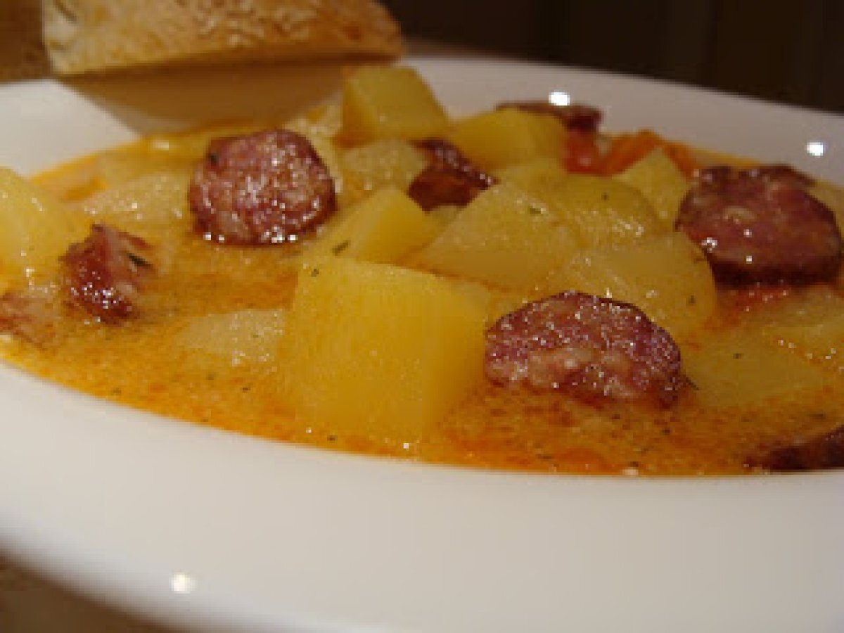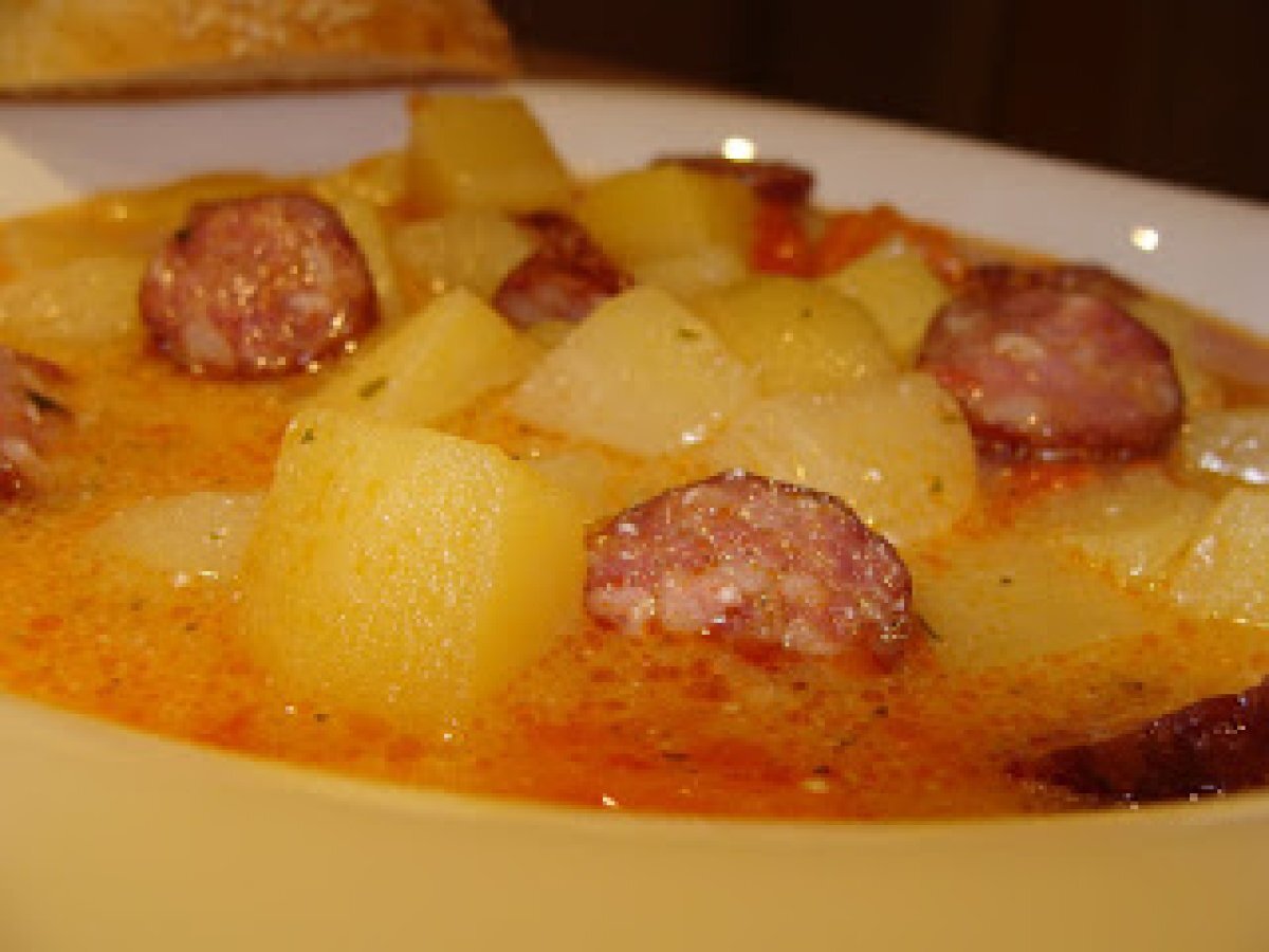 Supa de cartofi cu carnati de casa PrecedentulUrmătorul Felul principalFoarte ușor40 min Trimite unui prieten Printează pagina Adresează o întrebare autorului Postează o poză cu rețeta gătită de tine Este o reteta simpla, usoara, rapida dar insa si satioasa. Ingrediente 6 1 kg cartofi 2 rosii potrivite, bine coapte 1 ardei 1ceapa 1 morcov maricel 1 fir lung de carnati de casa sau de care aveti la indemana sare, piper, boia, patrunjel 3 linguri ulei 1 lingurita boia 200 g smantana