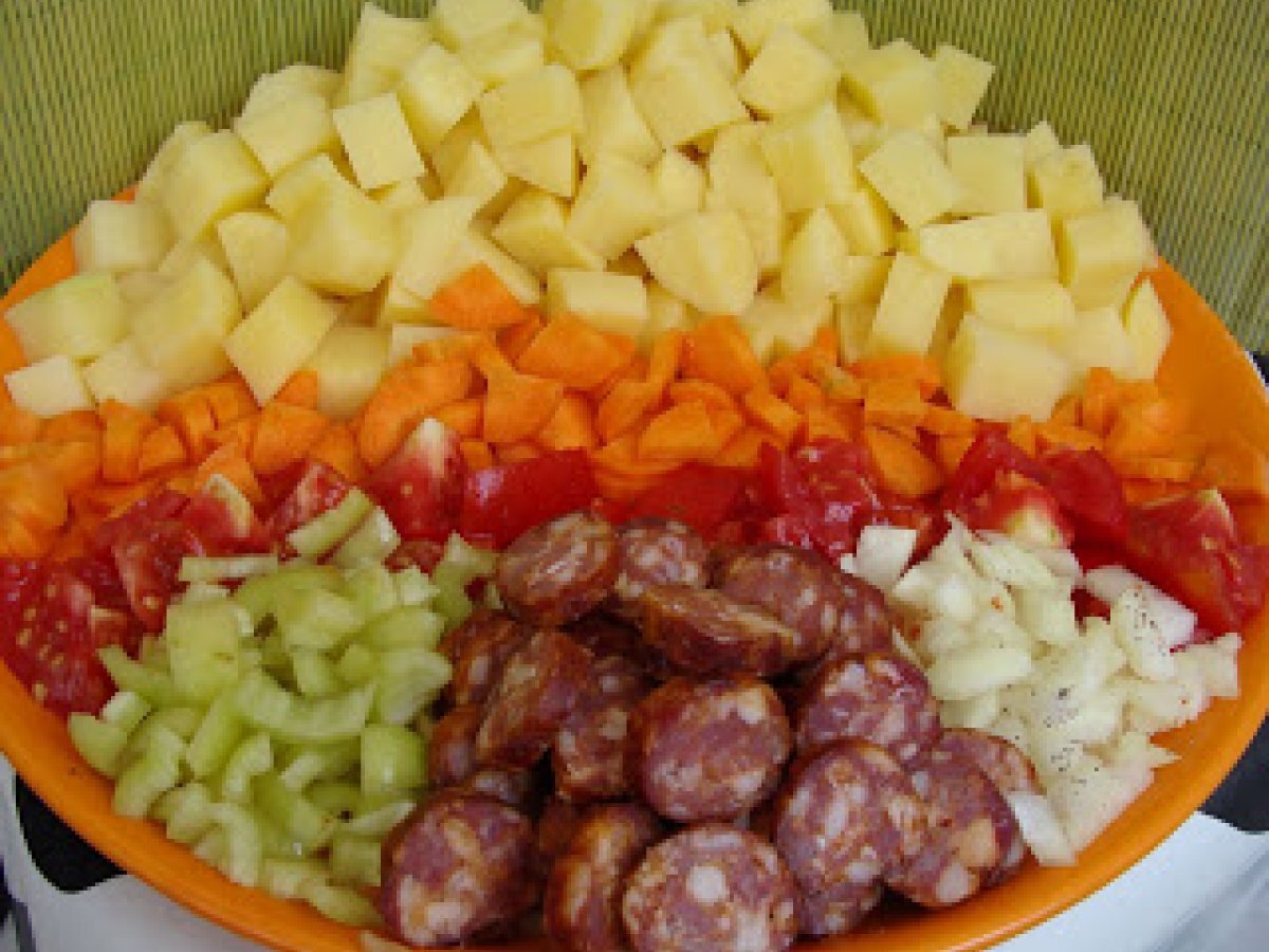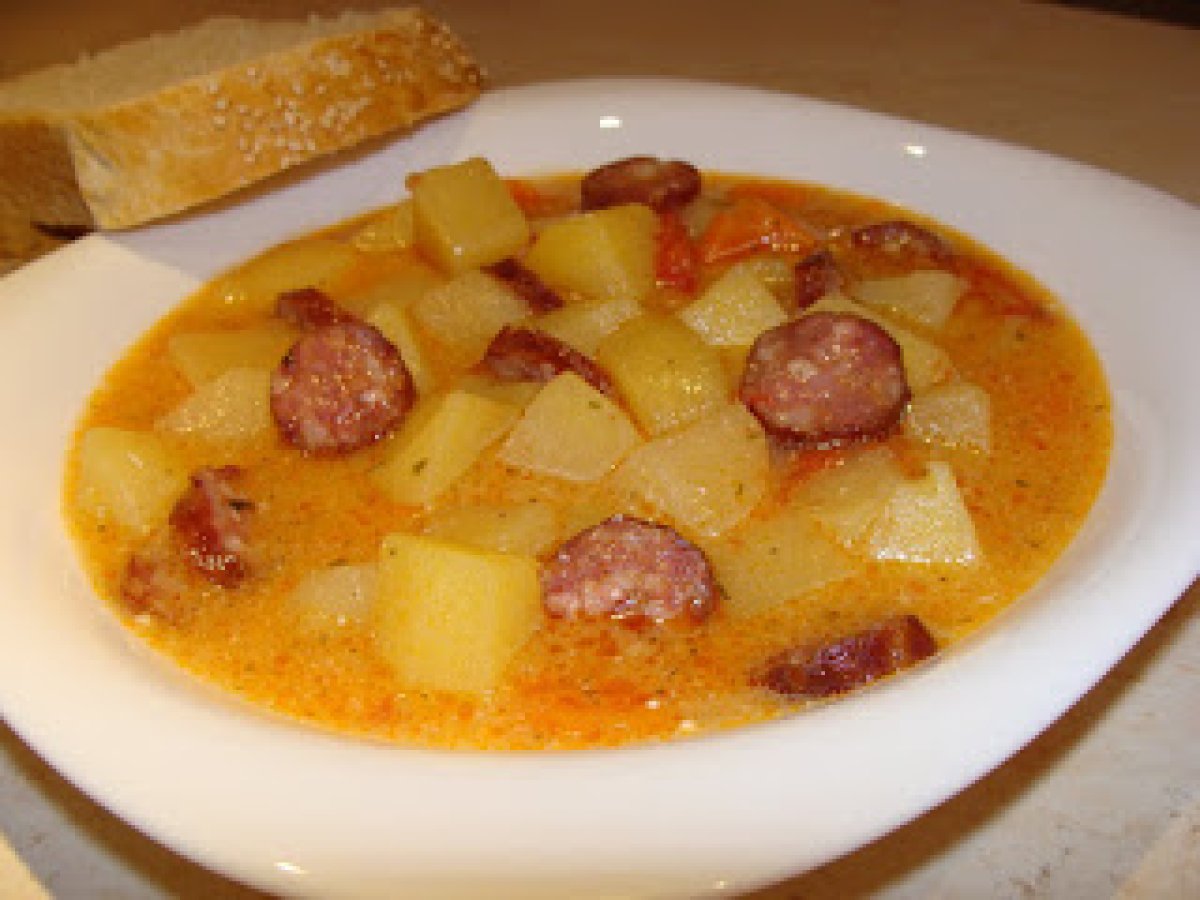Supa de cartofi cu carnati de casa PrecedentulUrmătorul Felul principalFoarte ușor50 min Trimite unui prieten Printează pagina Adresează o întrebare autorului Postează o poză cu rețeta gătită de tine Este o reteta simpla, usoara, rapida dar insa si satioasa. Ingrediente 6 1 kg cartofi 2 rosii potrivite, bine coapte 1 ardei 1ceapa 1 morcov maricel 1 fir lung de carnati de casa sau de care aveti la indemana sare, piper boia, patrunjel 3 linguri ulei 1 lingurita boia 200 g smantana