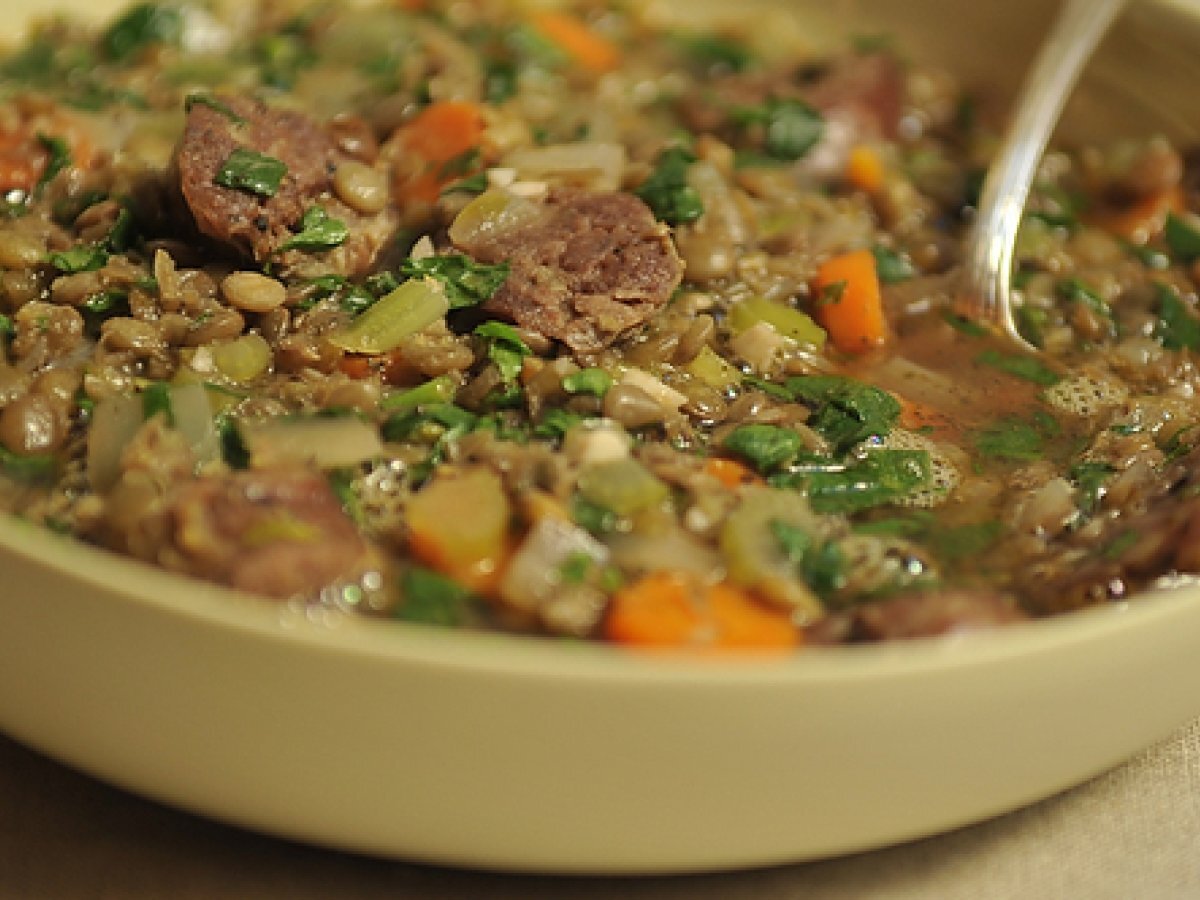 Supa de linte cu carnati PrecedentulUrmătorul Felul principalUșor1 h 30 m Trimite unui prieten Printează pagina Adresează o întrebare autorului Postează o poză cu rețeta gătită de tine carnati, linte, morcovi Ingrediente 6 200 grame linte verde 2 frunze dafin 3 linguri ulei 3-4 carnati 1 ceapa mare 4 catei usturoi 100 ml vin rosu 1 telina mare (inclusiv cu frunze) 4-5 morcovi 1 litru zeama de pui 200 grame spanac crud 1 legatura patrunjel 1 lingura maghiran uscat Sare Piper