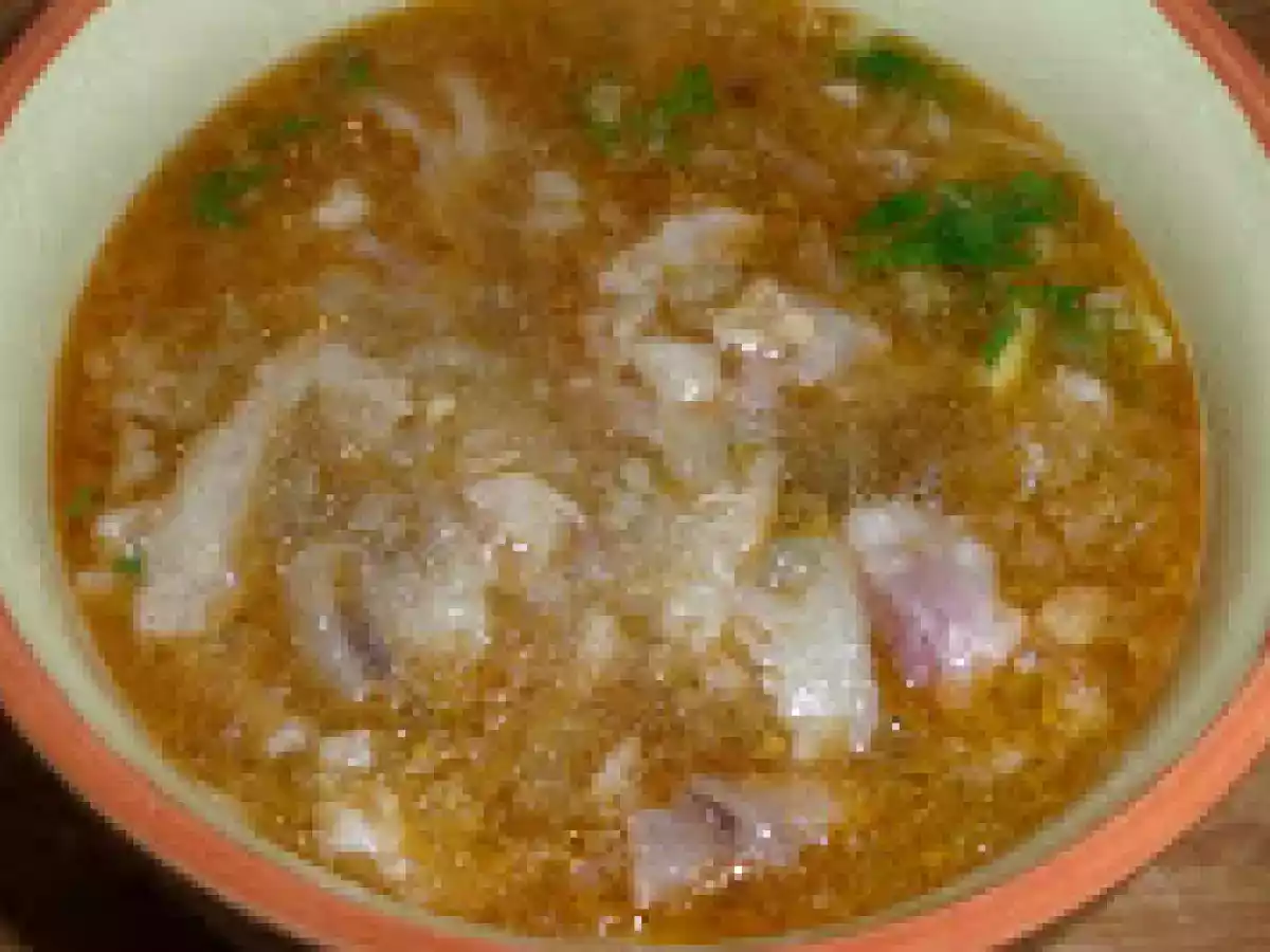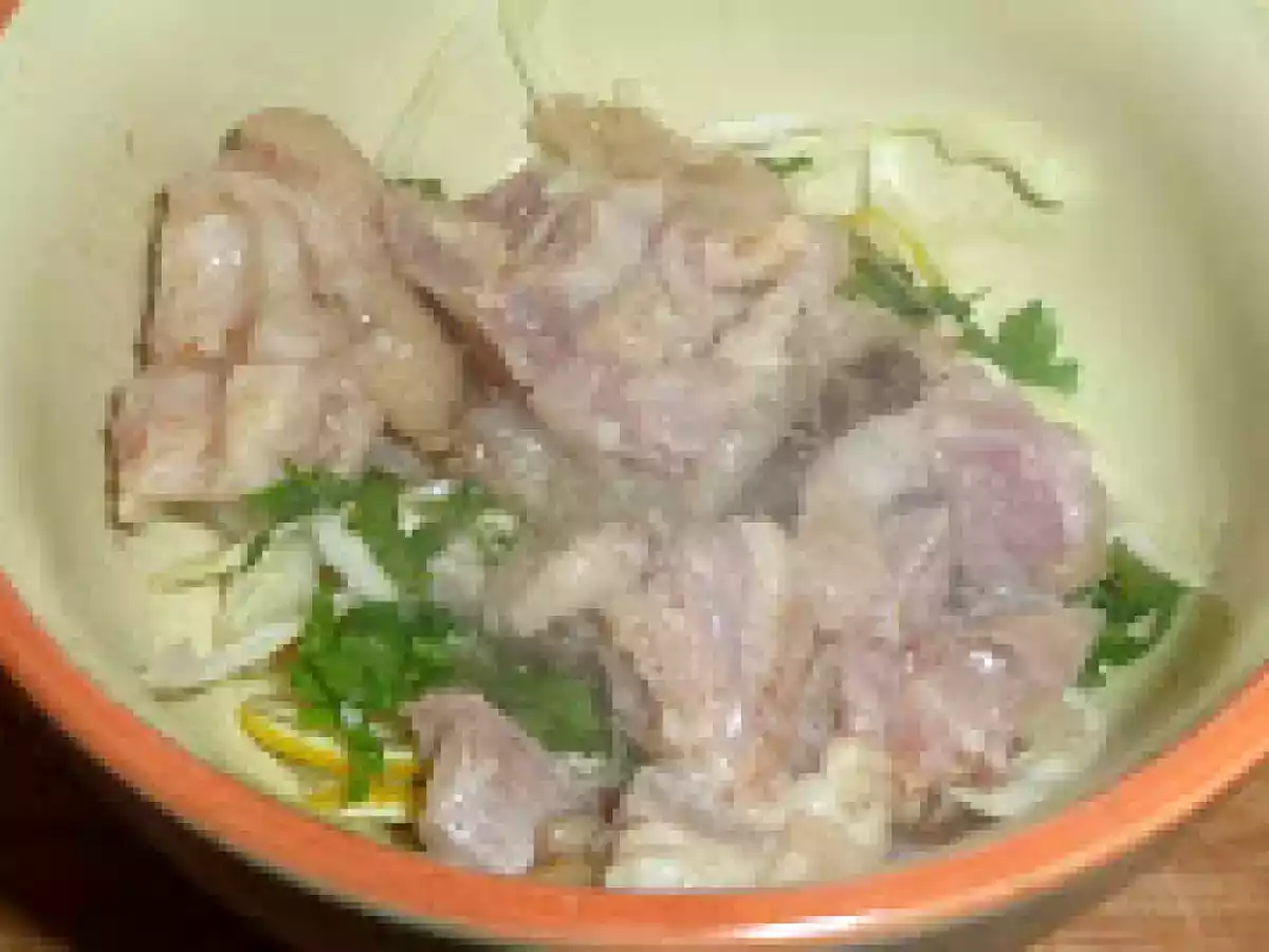 Supa de picioare de porc (buun geo heo) - vietnam PrecedentulUrmătorul Felul principalFoarte ușor50 min Trimite unui prieten Printează pagina Adresează o întrebare autorului Postează o poză cu rețeta gătită de tine Ingrediente 2 picioare de porc (preferabil mai slab) 2 morcovi 1 pastarnac 1 ceapa cativa catei de usturoi boia de ardei dulce sau iute dupa preferinta sare, zahar, piper, sos de soia varza taiata fin coriandru, patrunjel, coaja de lamaie ardei iute taietei din faina de orez
