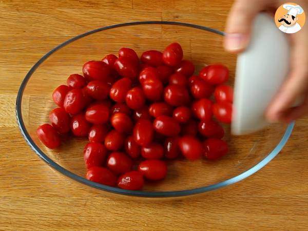 Acoperiti cu ulei de masline. Adaugati praful de sare, piper si rozmarinul uscat, apoi amestecati totul.