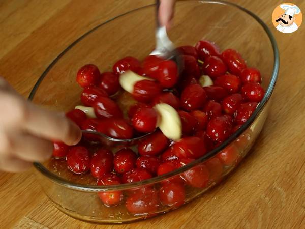 Curatati catei de usturoi. Spalati rosiile, apoi transferati-le intr-un vas potrivit pentru cuptor.