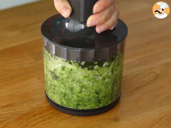 Intr-un chopper, puneti ceapa, catelul de usturoi, patrunjelul si coriandrul spalate. Tocati bine.