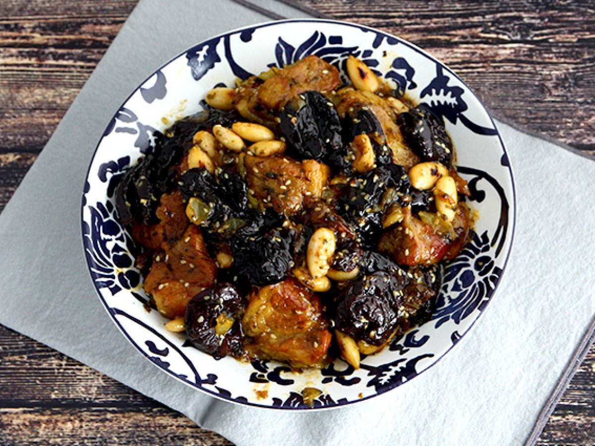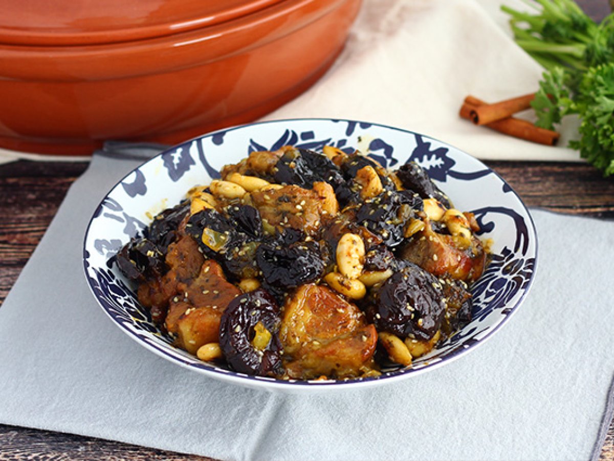 Tajine este un fel de mancare marocan, care si-a imprumutat numele de la vasul in care se gateste. Acesta este din lut si este format din doua parti: o baza de forma unei farfurii adanci si un capac tronconic, prevazut cu o mica gaura, pentru a lasa sa scape o parte din aburi. Noi am gatit astazi: tajine cu miel si prune.