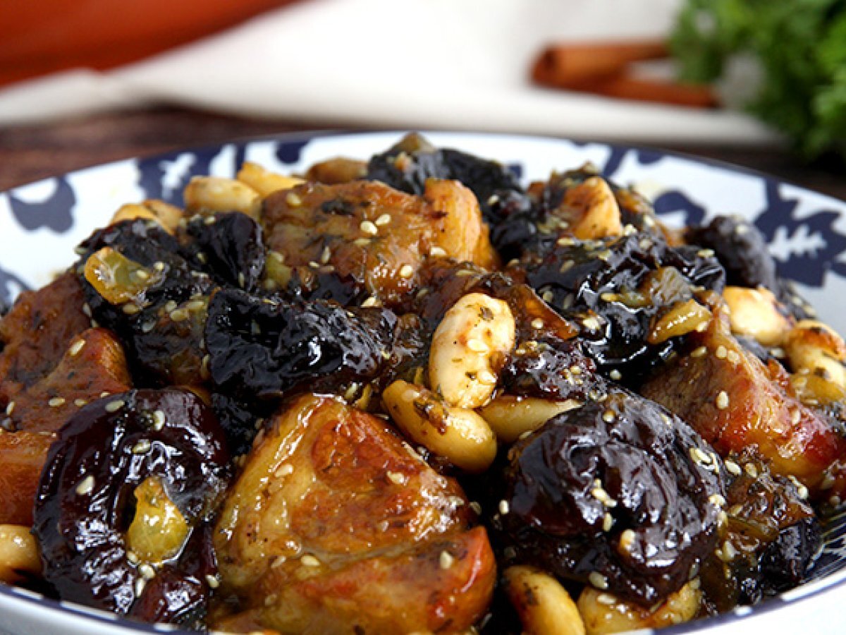 Dupa acest timp, adaugati prunele si sucul lor la tajine. Adaugati si migdalele si semintele de susan. Se amesteca, se acopera si se fierbe inca 20 de minute.