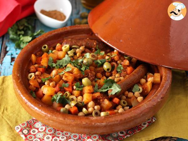 Vasul tradițional de tajine este ideal, dar poți folosi și o oală Cocotte, care va menține umiditatea și va permite gătirea uniformă a ingredientelor.
