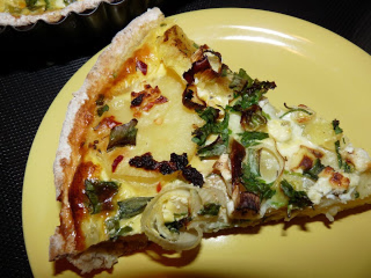 Tarta cu praz si cartofi PrecedentulUrmătorul Felul principalFoarte ușor50 min Trimite unui prieten Printează pagina Adresează o întrebare autorului Postează o poză cu rețeta gătită de tine Ingrediente 8 170 g. faina; 3 linguri ulei de floarea soarelui; 1 ou; cimbru, tarhon, busuioc; 300 gr. cartofi; 250 gr. praz; 2 oua; 150 ml. lapte; 1 lg iute ardei iute; sare, piper, ceapa verde;