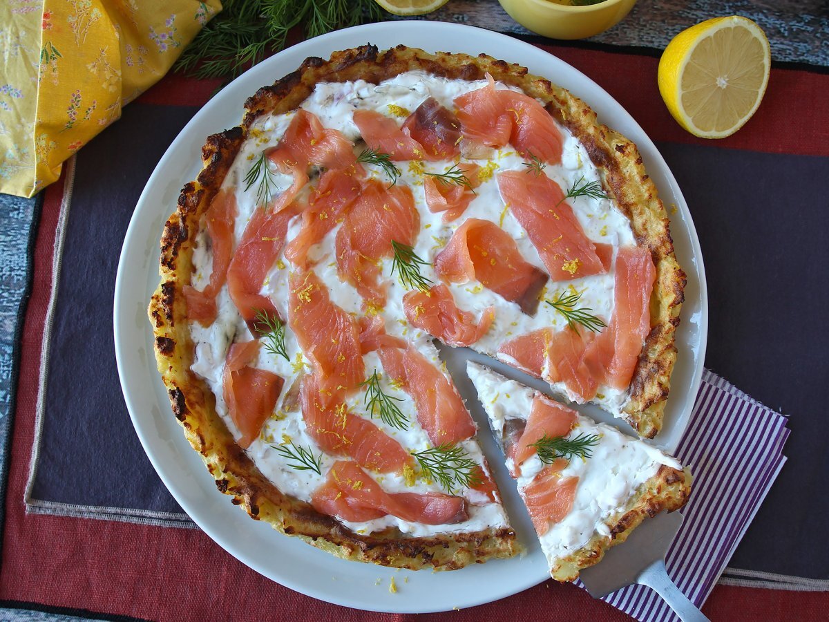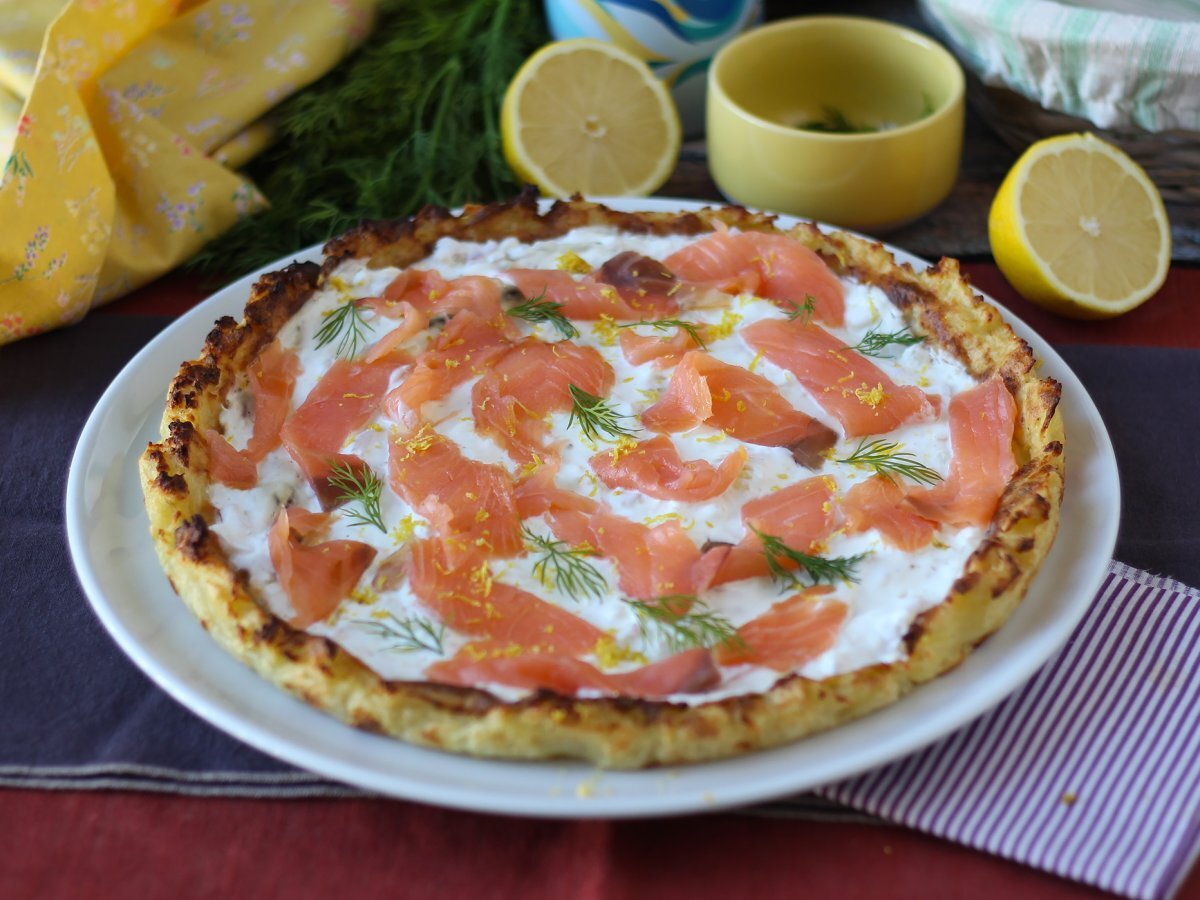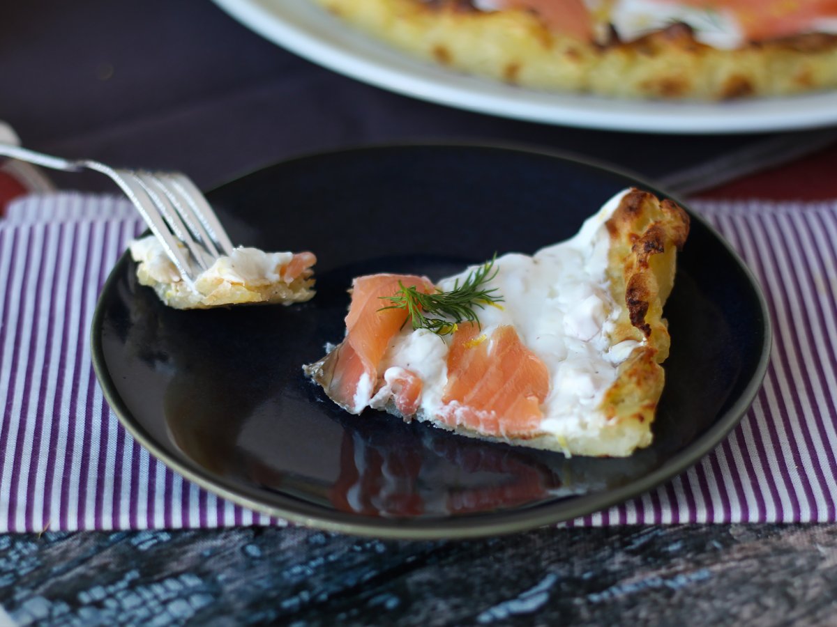 Nu mai aveți în frigider aluat de foitaj pentru tarta dvs.? Nu intrați în panică! Încearcați această versiune originală făcută cu cartofi și somon afumat! Luați-vă adio de la aluatul clasic, aici cartofii formează o bază crocantă, care se topește în gură. Perfectă pentru o cină ușoară sau un brunch gourmet, de exemplu (tăiată în felii mici), această rețetă cu siguranță îți va încânta oaspeții ;)