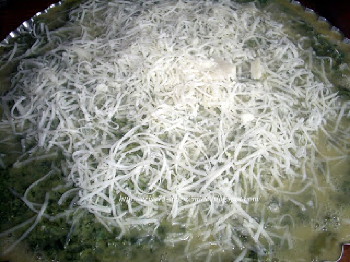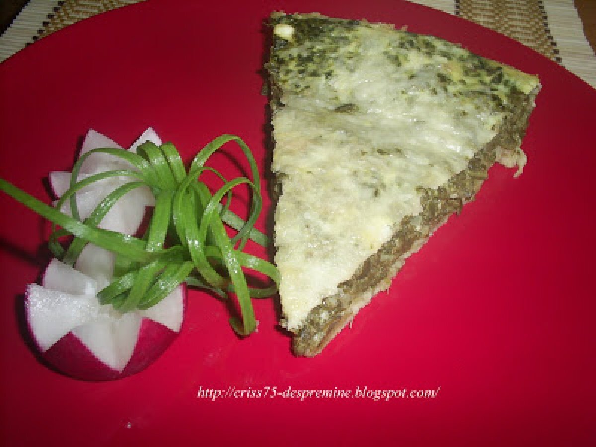 Tarta cu spanac si feta PrecedentulUrmătorul Felul principalFoarte ușor1 h 25 m Trimite unui prieten Printează pagina Adresează o întrebare autorului Postează o poză cu rețeta gătită de tine Ingrediente 8 Pentru aluat: 250 g faina 100 g unt rece 1 galbenus de ou sare 2 linguri apa rece (cu gheata daca se poate) 1 kg spanac (e prea mult, mie mai ramas deci 800 g spanac proaspat e suficient) 250 g branza feta 3 fire de ceapa verde optional usturoi (eu n-am pus) 3 oua 100 g cascaval sare ulei de masline