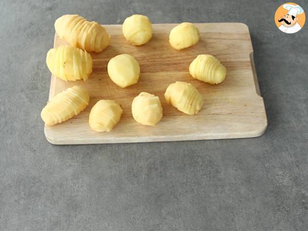Decojiti si taiati cartofi si ceapa in felii subtiri.