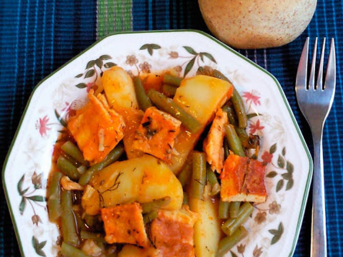 Tocanita de cartofi si oua votează acum Felul principalFoarte ușor35 min Trimite unui prieten Printează pagina Adresează o întrebare autorului Postează o poză cu rețeta gătită de tine Ingrediente 4 1 kg cartofi 250 g teci subtiri 250 g pasta de rosii 2 oua 2 linguri faina 4-5 linguri ulei de masline 3 graunti de usturoi 1 lingurita cimbru 2 lingurite marar un praf de cayena sare dupa gust