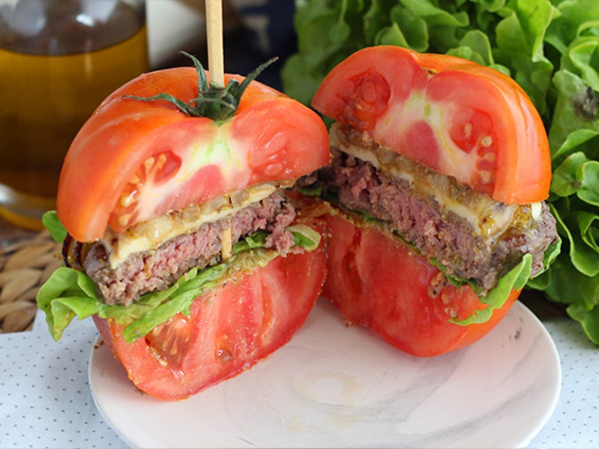 Un burger fara gluten pentru toate persoanele cu intolerante si alergii. Inlocuiti painea cu un fruct ;-) Da, ati citit corect: UN FRUCT! Luati cea mai buna si mare rosie suculenta, taiati-o in jumatate si puneti-o in loc de paine!