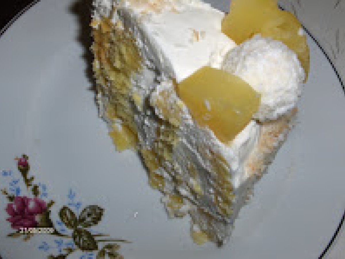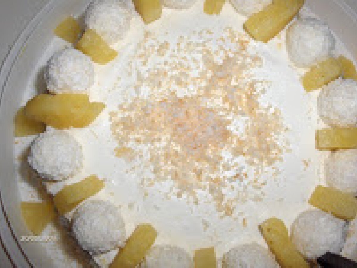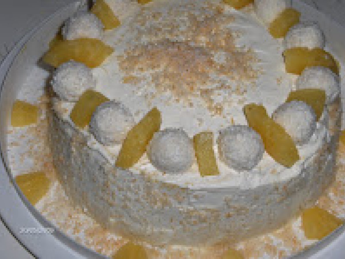 Tort spirala cu ananas PrecedentulUrmătorul Felul principalFoarte ușor1 h 5 m Trimite unui prieten Printează pagina Adresează o întrebare autorului Postează o poză cu rețeta gătită de tine Ingrediente 4 5 oua 5 g zahar 5 g faina 5 linguri apa un praf de copt Crema: 500 g. Mascarpone 200 g. smantana sucul de la o lamaie 250 g. zahar 4 plicuri gelatina 400 ml. frisca lichida 1 conserva ananas Pentru ornat: bomboane raffaello nuca de cocos coapta un pic ananas bucati frisca