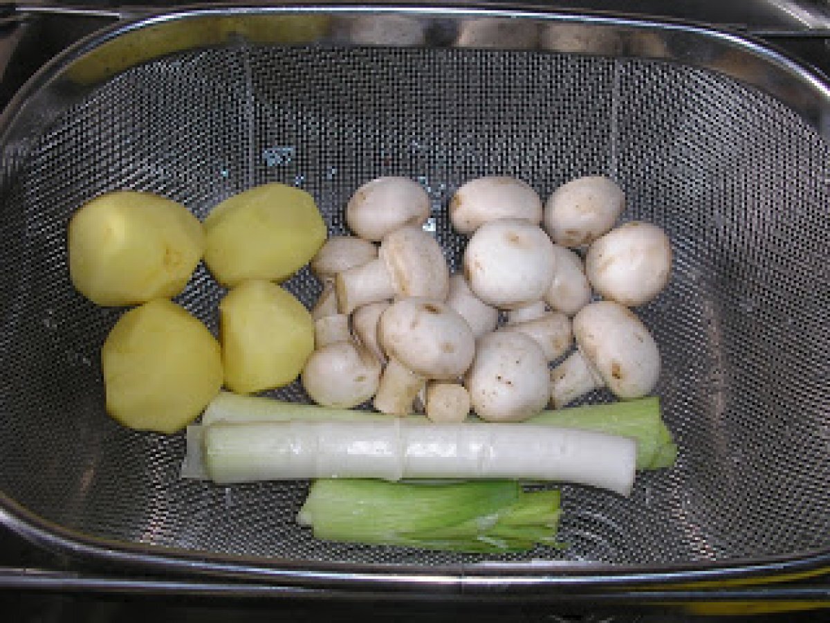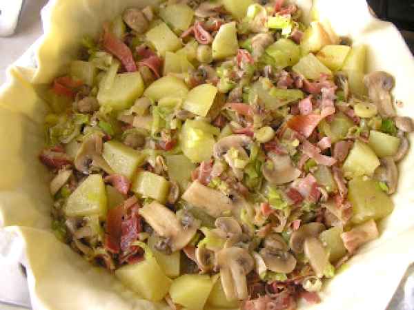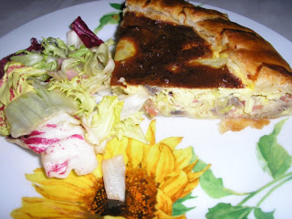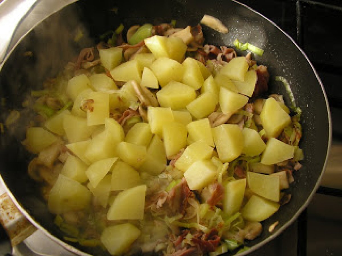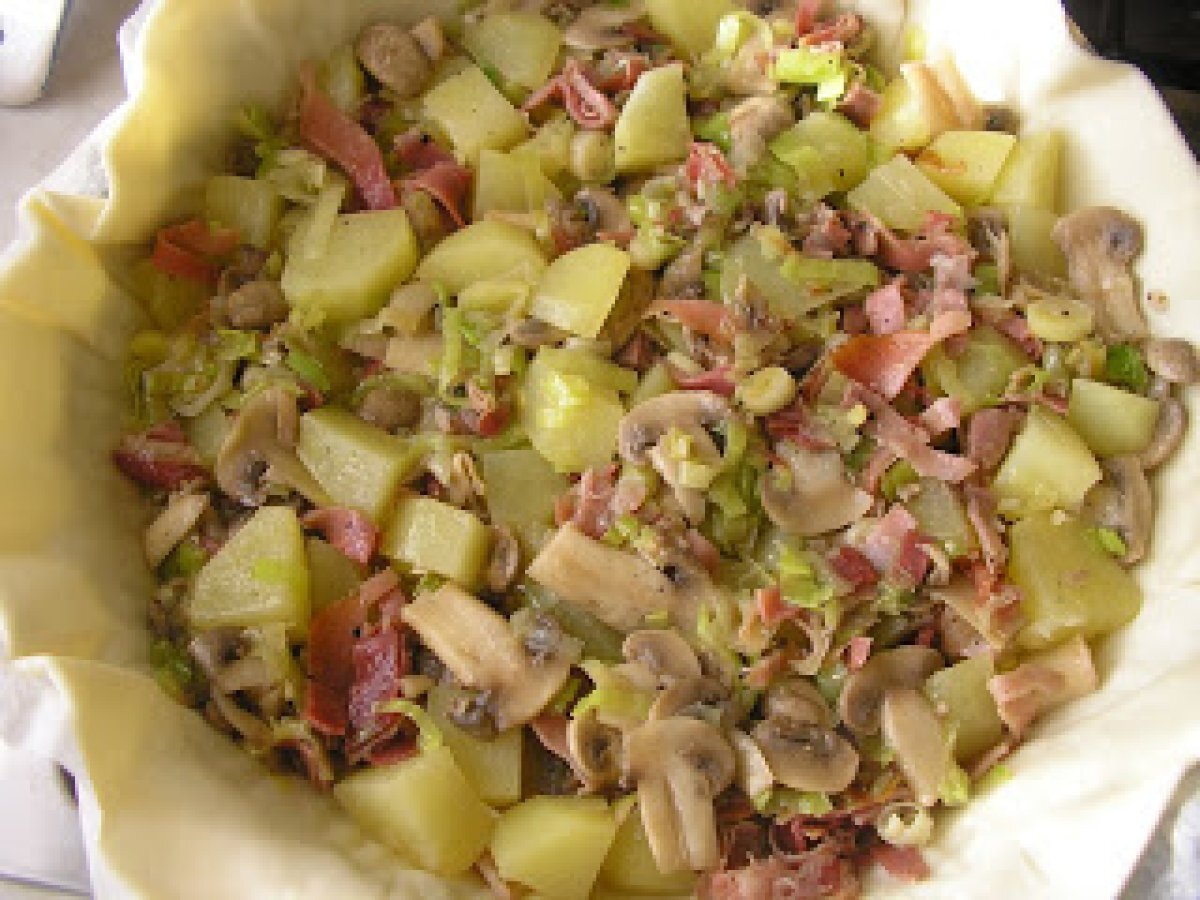Torta salata con patate e funghi (tarta sarata cu cartofi si ciuperci) PrecedentulUrmătorul Felul principalFoarte ușor1 oră Trimite unui prieten Printează pagina Adresează o întrebare autorului Postează o poză cu rețeta gătită de tine Ingrediente 4 1 foaie de aluat 4 cartofi mici, 200 g ciuperci 1 praz 3 oua 100 g branza rasa 50 g sunca afumata 1 cescuta de lapte ulei sare si piper.