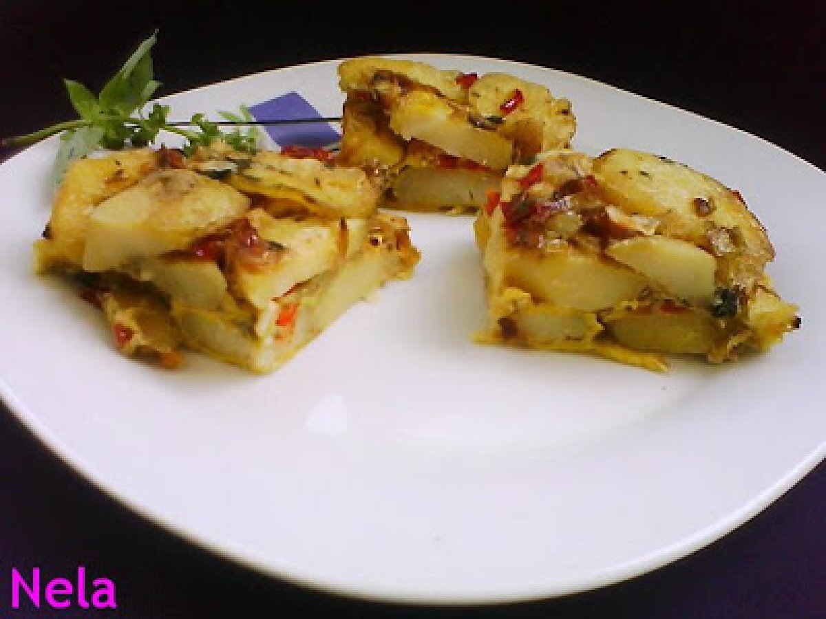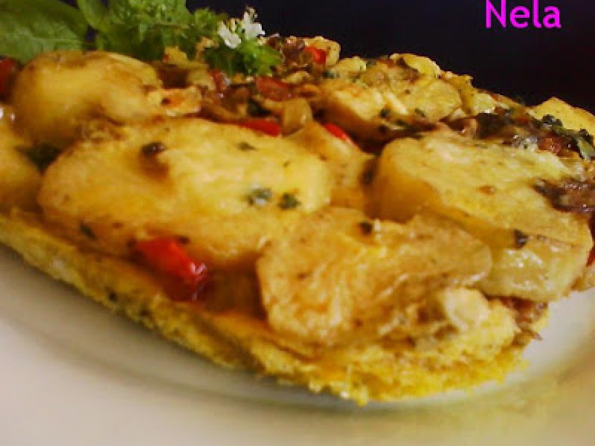 Tortilla cu cartofi si piept de pui PrecedentulUrmătorul Felul principalFoarte ușor35 min Trimite unui prieten Printează pagina Adresează o întrebare autorului Postează o poză cu rețeta gătită de tine Ingrediente 4 500 g cartofi 1 ceapa mare ulei pentru calit 4 oua o jumate de piept de pui 2 ardei capia rosu 1 ardei galben o legatura patrunjel sare,piper,busuioc,oregano