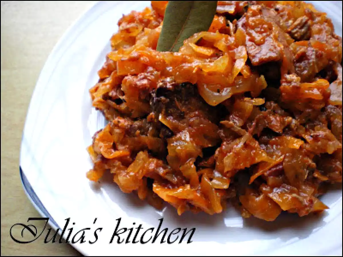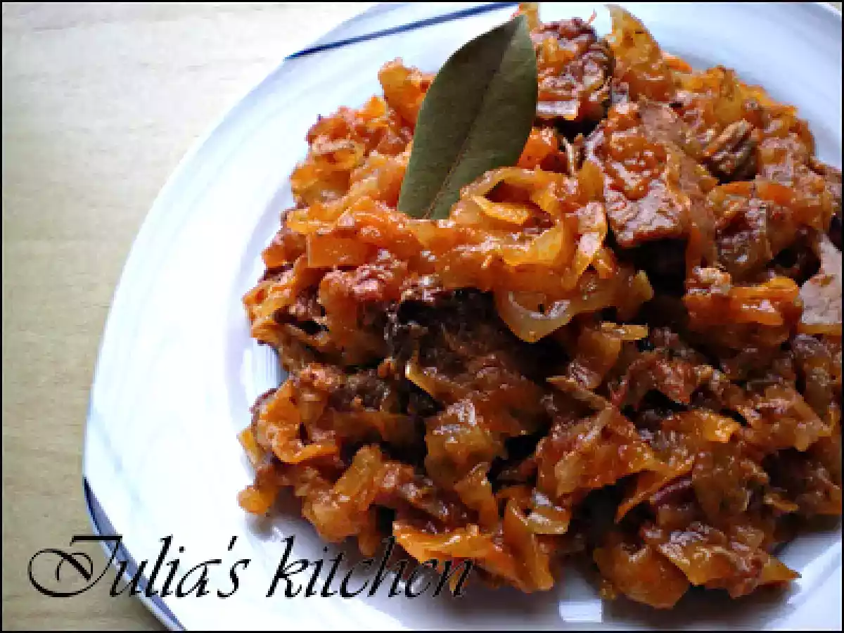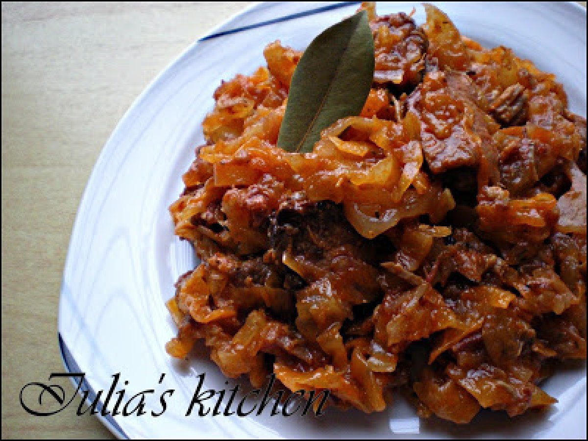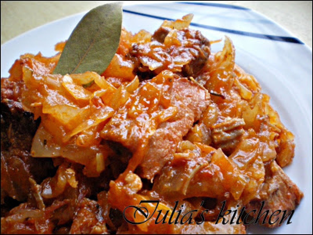Varza calita cu afumatura PrecedentulUrmătorul Felul principalFoarte ușor35 min Trimite unui prieten Printează pagina Adresează o întrebare autorului Postează o poză cu rețeta gătită de tine Ingrediente 4 1 varza murata afumatura de porc 1 ceapa 3 frunze de dafin cimbru 3 linguri pasta de tomate.