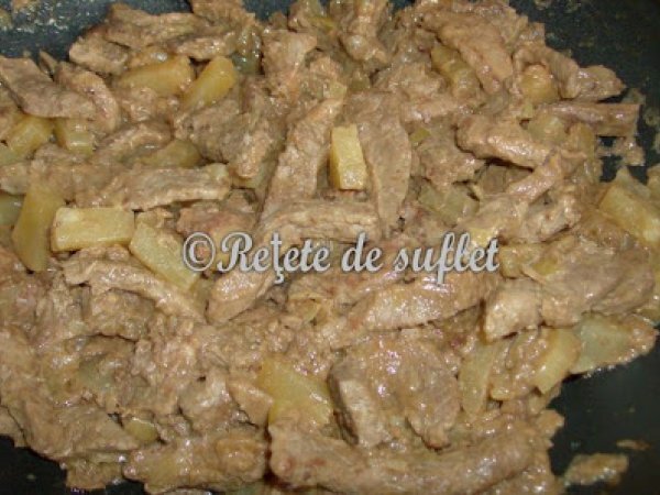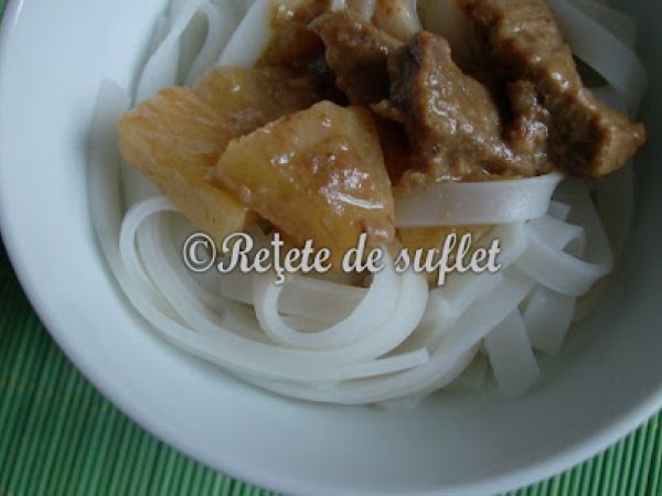 Vita stir- fry cu ananas PrecedentulUrmătorul Felul principalFoarte ușor1 oră Trimite unui prieten Printează pagina Adresează o întrebare autorului Postează o poză cu rețeta gătită de tine Ingrediente 4 500 g vita, taiata fasii subtiri (cam 2 x 5 cm) 100 g ananas (daca e din conserva, sa nu fie cu zahar!), taiat bucatele 3 cepe verzi, tocate marunt 5 cm ghimbir ras 4- 5 linguri sos soia (sosul de soia se foloseste in loc de sare) 100 ml vin de orez (sau vin alb sec) 3 linguri ulei de porumb (sau floarea soarelui, sau arahide) Marinada 2 linguri amidon de porumb 1 albus batut 1 lingura sos soia 4 linguri de ulei