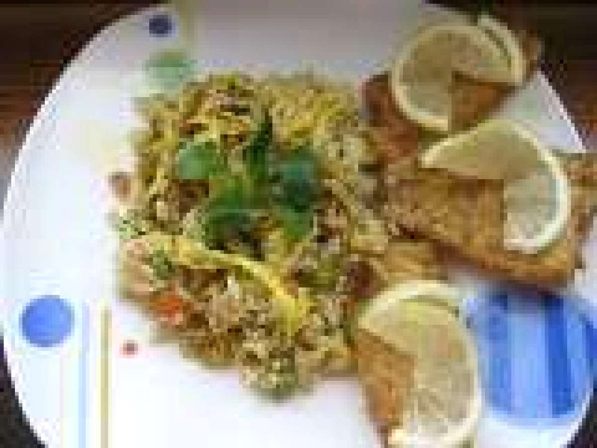 pestele prajit se scurge pe un servetel si se serveste stropit cu lamaie, iar garnitura am facut un orez cu legume si ou.