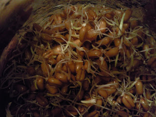 Se lasa graul sa germineze in borcan, fara apa, 3-4 zile, repetand operatiunea de clatire si spalare a fermentilor, de 2 ori pe zi (eu lam clatit dimineata si seara).